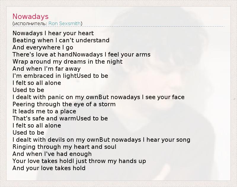 Nowadays I hear your heart Beating when I can't understand And everywhere I go There's love at handNowadays I feel your arms Wrap around my dreams in the night And when I'm far away I'm embraced in lightUsed to be I felt so all alone Used to be I dealt with panic on my ownBut nowadays I see your face Peering through the eye of a storm It leads me to a place That's safe and warmUsed to be I felt so all alone Used to be I dealt with devils on my ownBut nowadays I hear your song Ringing through my heart and soul And when I've had enough Your love takes holdI just throw my hands up And your love takes hold