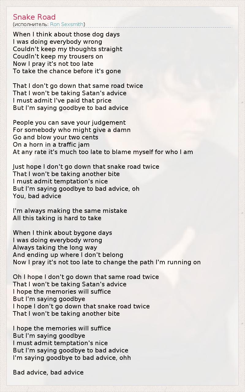 When I think about those dog days I was doing everybody wrong Couldn't keep my thoughts straight Coudln't keep my trousers on Now I pray it's not too late To take the chance before it's gone That I don't go down that same road twice That I won't be taking Satan's advice I must admit I've paid that price But I'm saying goodbye to bad advice People you can save your judgement For somebody who might give a damn Go and blow your two cents On a horn in a traffic jam At any rate it's much too late to blame myself for who I am Just hope I don't go down that snake road twice That I won't be taking another bite I must admit temptation's nice But I'm saying goodbye to bad advice, oh You, bad advice I'm always making the same mistake All this taking is hard to take When I think about bygone days I was doing everybody wrong Always taking the long way And ending up where I don't belong Now I pray it's not too late to change the path I'm running on Oh I hope I don't go down that same road twice That I won't be taking Satan's advice I hope the memories will suffice But I'm saying goodbye I hope I don't go down that snake road twice That I won't be taking another bite I hope the memories will suffice But I'm saying goodbye I must admit temptation's nice But I'm saying goodbye to bad advice I'm saying goodbye to bad advice, ohh Bad advice, bad advice