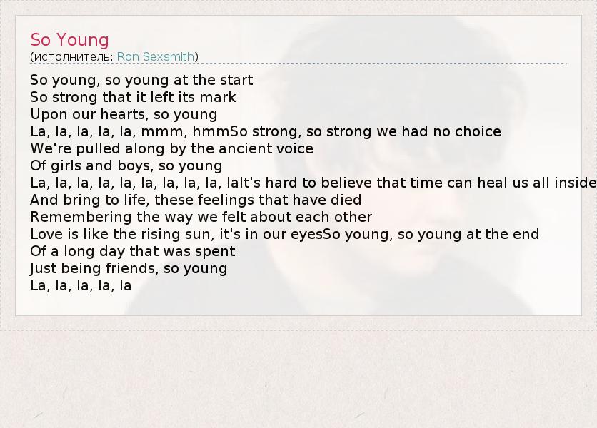 So young, so young at the start So strong that it left its mark Upon our hearts, so young La, la, la, la, la, mmm, hmmSo strong, so strong we had no choice We're pulled along by the ancient voice Of girls and boys, so young La, la, la, la, la, la, la, la, la, laIt's hard to believe that time can heal us all inside And bring to life, these feelings that have died Remembering the way we felt about each other Love is like the rising sun, it's in our eyesSo young, so young at the end Of a long day that was spent Just being friends, so young La, la, la, la, la