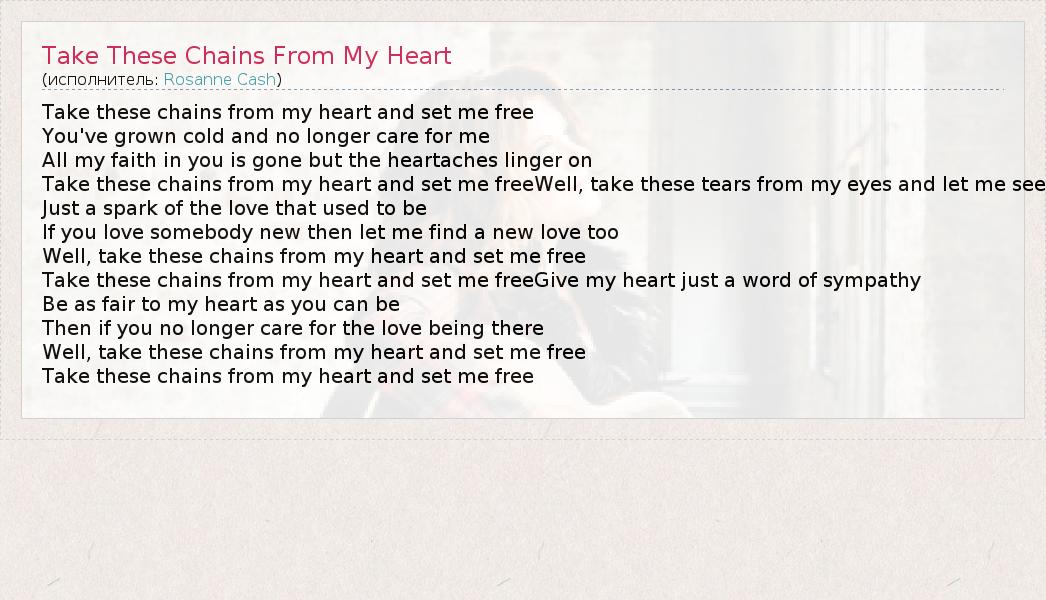 Take these chains from my heart and set me free You've grown cold and no longer care for me All my faith in you is gone but the heartaches linger on Take these chains from my heart and set me freeWell, take these tears from my eyes and let me see Just a spark of the love that used to be If you love somebody new then let me find a new love too Well, take these chains from my heart and set me free Take these chains from my heart and set me freeGive my heart just a word of sympathy Be as fair to my heart as you can be Then if you no longer care for the love being there Well, take these chains from my heart and set me free Take these chains from my heart and set me free