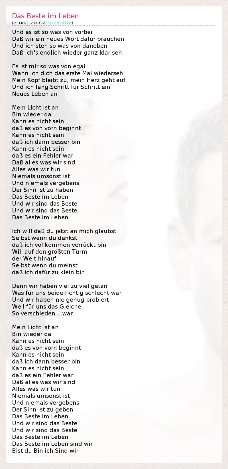Und эс ист так было фон Vorbei DASS Wir Эйн Neues сусла dafür brauchen Und Ich steh так было фон daneben DASS Ich-х Endlich Wieder Ганц Клар SEH Эс ист мир так было фон Эгаль Wann Ich Dich Das Erste Мал wiederseh " Майн Копф Bleibt цу, Mein Herz Гехт Auf Und Ich клык Schritt für Schritt Эйн Neues Leben Майн Лихт ист Бен Wieder да Канн-эс Nicht зет DASS эс фон Vorn beginnt Канн-эс Nicht зет DASS Ich Данн Бессер бен Канн-эс Nicht зет Dass эс Эйн Fehler война DASS Alles Wir был Синд Alles Wir был тун Niemals umsonst IST Und Niemals vergebens Der Sinn IST цу Haben Das Beste им Leben Und Wir Синд дас Beste Und Wir Синд дас Beste Das Beste им Leben Ich Will Dass дю Jetzt Мичиган glaubst Ванесса Венна дю denkst Dass ич vollkommen verrückt бен Будет Auf ден größten Turm дер Вельт hinauf Ванесса Венна дю meinst DASS Ich dafür цу Klein бен Денн Wir Haben Viel Viel Zu getan Был für UNS Beide Richtig Schlecht война Und Wir Haben ние genug probiert Вайль für UNS дас Gleiche Так verschieden ... война Майн Лихт ист Бен Wieder да Канн-эс Nicht зет DASS эс фон Vorn beginnt Канн-эс Nicht зет DASS Ich Данн Бессер бен Канн-эс Nicht зет Dass эс Эйн Fehler война DASS Alles Wir был Синд Alles Wir был тун Niemals umsonst IST Und Niemals vergebens Der Sinn IST цу Гебен Das Beste им Leben Und Wir Синд дас Beste Und Wir Синд дас Beste Das Beste им Leben Das Leben Beste им Синд Wir Bist дю Биня Ich Синд Wir