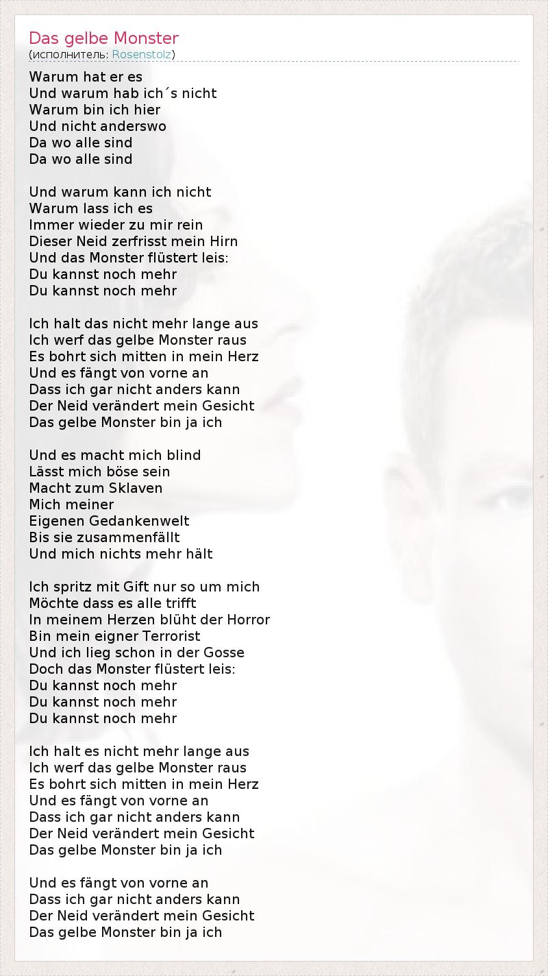 Варум шляпа ER ES Und Варум Жил ich's Nicht Варум бен Ich Хир Und Nicht anderswo Да горе Все Синд Да горе Все Синд Und Варум канн ич Nicht Варум девушка Ich ES Immer Wieder цу мир Рейн Dieser NEID zerfrisst Mein Хирн Und Das Монстр flüstert леев: Du kannst Ночь Mehr Du kannst Ночь Mehr Ich остановить дас Nicht Mehr Ланге AUS Ich Werf дас Gelbe Монстр Раус Es bohrt Сич рукавица в Mein Herz Und ES fängt фон Vorne ап Dass Ich гр Nicht Андерс Канн Der Neid verändert Mein Gesicht Das Gelbe Монстр бен JA Ich Und ES Macht Мичиган слепой Lasst Мичиган Böse Sein Macht Zum Sklaven Mich Meiner Eigenen Gedankenwelt Бис Sie zusammenfällt Und Mich Nichts Mehr остановить Ich брызгать MIT подарков Нур так гм Мичиган Möchte Dass ES Все trifft В meinem Герцена blüht дер ужасов Бен Mein Eigner Terrorist Und Ich Lieg Шон ин-дер-Госсе Дочь дас Монстр flüstert леев: Du kannst Ночь Mehr Du kannst Ночь Mehr Du kannst Ночь Mehr Ich остановить ES Nicht Mehr Ланге AUS Ich Werf дас Gelbe Монстр Раус Es bohrt Сич рукавица в Mein Herz Und ES fängt фон Vorne ап Dass Ich гр Nicht Андерс Канн Der Neid verändert Mein Gesicht Das Gelbe Монстр бен JA Ich Und ES fängt фон Vorne ап Dass Ich гр Nicht Андерс Канн Der Neid verändert Mein Gesicht Das Gelbe Монстр бен JA Ich