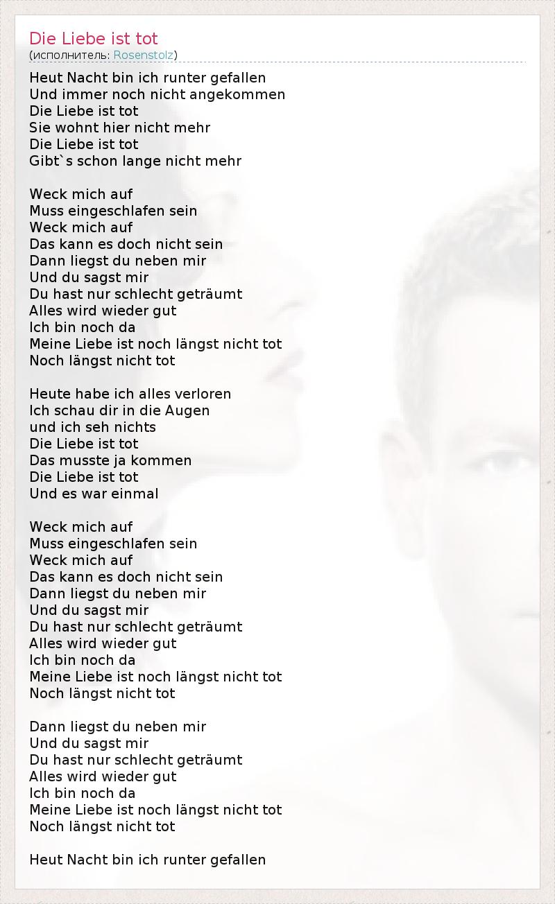 Heut Nacht бен ич Runter gefallen Und Immer Ночь Nicht angekommen Die Liebe Ist малыш Sie wohnt иерархи Nicht Mehr Die Liebe Ist малыш Gibt `ы Шон Ланге Nicht Mehr Weck Mich Ауф Мусса eingeschlafen Sein Weck Mich Ауф Das Канн -эс DOCH Nicht Sein Данн liegst дю Небен мир Und дю sagst мир Du Ты нур Schlecht geträumt Alles WIRD Wieder кишки Ich бен Ночь да Моя Liebe ист Ночь längst Nicht малыш Ночь längst Nicht малыш Heute хабе ич Alles Верлорен Ich Schau реж в фильеры Augen унд ич SEH Nichts Die Liebe Ist малыш Das musste JA Kommen Die Liebe Ist малыш Und эс война Einmal Weck Mich Ауф Мусса eingeschlafen Sein Weck Mich Ауф Das Канн -эс DOCH Nicht Sein Данн liegst дю Небен мир Und дю sagst мир Du Ты нур Schlecht geträumt Alles WIRD Wieder кишки Ich бен Ночь да Моя Liebe ист Ночь längst Nicht малыш Ночь längst Nicht малыш Данн liegst дю Небен мир Und дю sagst мир Du Ты нур Schlecht geträumt Alles WIRD Wieder кишки Ich бен Ночь да Моя Liebe ист Ночь längst Nicht малыш Ночь längst Nicht малыш Heut Nacht бен ич Runter gefallen