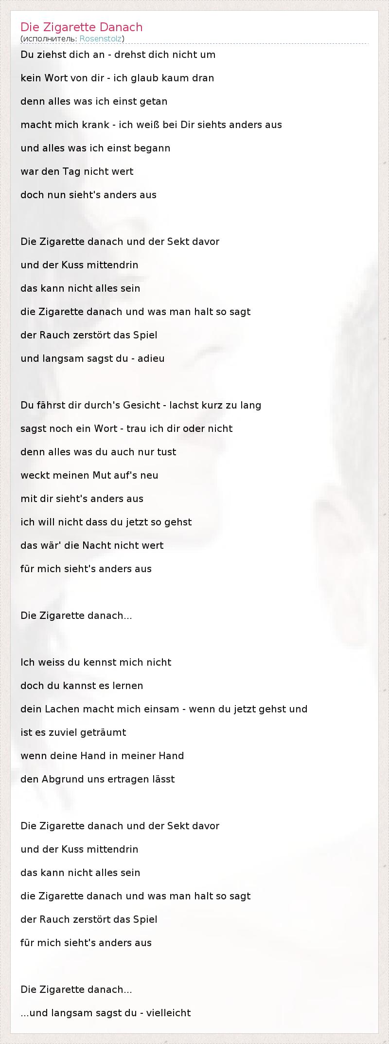 Du ziehst dich an - drehst dich nicht um kein Wort von dir - ich glaub kaum dran denn alles was ich einst getan macht mich krank - ich weiß bei Dir siehts anders aus und alles was ich einst begann war den Tag nicht wert doch nun sieht's anders aus Die Zigarette danach und der Sekt davor und der Kuss mittendrin das kann nicht alles sein die Zigarette danach und was man halt so sagt der Rauch zerstört das Spiel und langsam sagst du - adieu Du fährst dir durch's Gesicht - lachst kurz zu lang sagst noch ein Wort - trau ich dir oder nicht denn alles was du auch nur tust weckt meinen Mut auf's neu mit dir sieht's anders aus ich will nicht dass du jetzt so gehst das wär' die Nacht nicht wert für mich sieht's anders aus Die Zigarette danach... Ich weiss du kennst mich nicht doch du kannst es lernen dein Lachen macht mich einsam - wenn du jetzt gehst und ist es zuviel geträumt wenn deine Hand in meiner Hand den Abgrund uns ertragen lässt Die Zigarette danach und der Sekt davor und der Kuss mittendrin das kann nicht alles sein die Zigarette danach und was man halt so sagt der Rauch zerstört das Spiel für mich sieht's anders aus Die Zigarette danach... ...und langsam sagst du - vielleicht