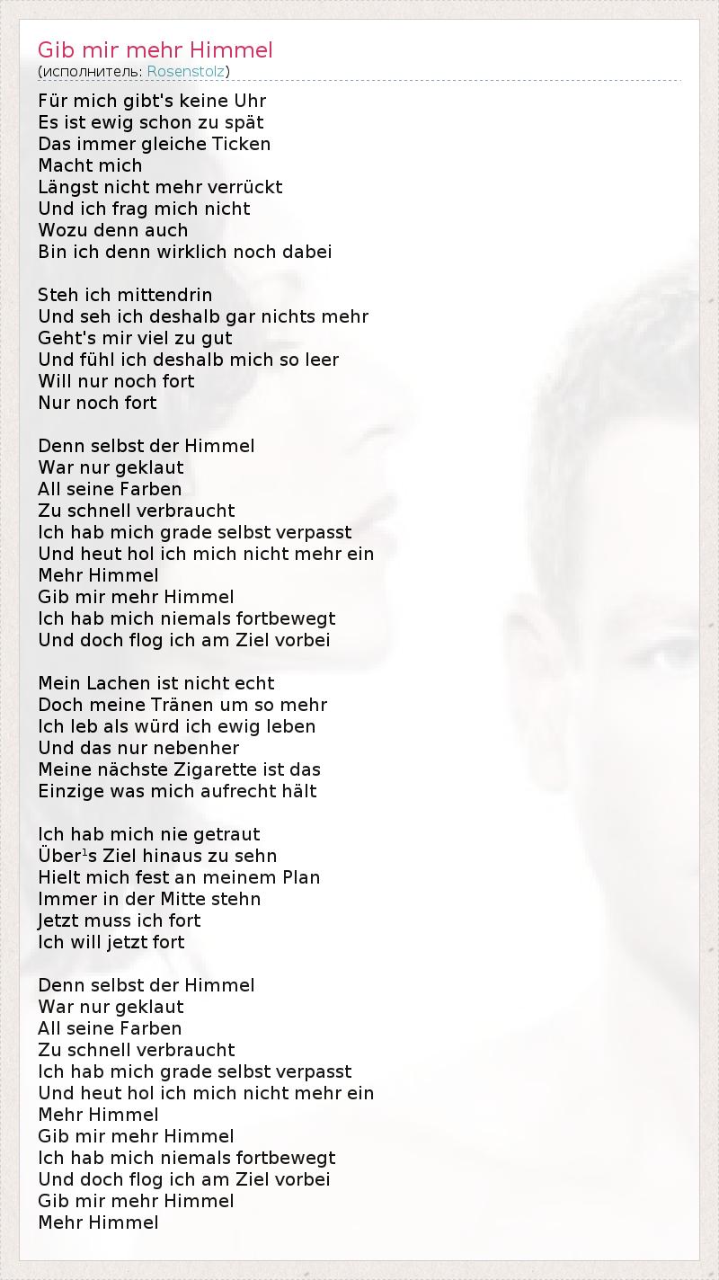 Keine Uhr für Mich gibt в Es ист Ewig Schon цу Spät Das Immer gleiche Ticken Махт Mich Längst Nicht Mehr verrückt Und ич фрагмент Mich Nicht Wozu Denn Ош Бен ич Denn Wirklich Ночь Dabei Steh ич Mittendrin Und SEH ич deshalb гр Nichts Mehr Мир Viel цу кишки Geht в Und fühl ич deshalb Mich так Leer Будет нур Ночь форт Нур Ночь форт Denn Селбст дер Химмель Война нур geklaut Все невод Farben Zu шнель verbraucht Ich хаб Mich класса Селбст verpasst Und heut хол ич Mich Nicht Mehr Эйн Мехр Химмель Гиб мир Mehr Химмель Ich хаб Mich Niemals fortbewegt Und DOCH Flog ич утра Зил Vorbei Mein Lachen ист Nicht Echt Дочь Моя Tränen мкм так Mehr Ich LEB лов würd ич Ewig Leben Und дас нур nebenher Моя nächste Zigarette ист дас Einzige был Mich Ауфрехт hält Ich хаб Mich ние getraut Uber ¹ с Зил Hinaus цу Sehn Hielt Mich фестmeinem план Immer в дер Митте Stehn Jetzt беспорядок ич форт Ich будет Jetzt форт Denn Селбст дер Химмель Война нур geklaut Все невод Farben Zu шнель verbraucht Ich хаб Mich класса Селбст verpasst Und heut хол ич Mich Nicht Mehr Эйн Мехр Химмель Гиб мир Mehr Химмель Ich хаб Mich Niemals fortbewegt Und DOCH Flog ич утра Зил Vorbei Гиб мир Mehr Химмель Мехр Химмель