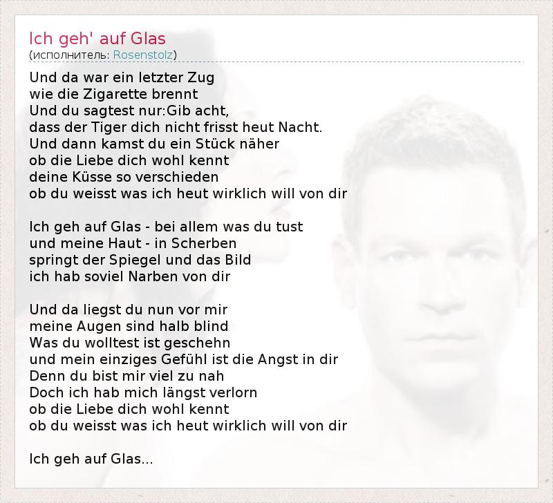 Und da war ein letzter Zug wie die Zigarette brennt Und du sagtest nur:Gib acht, dass der Tiger dich nicht frisst heut Nacht. Und dann kamst du ein Stück näher ob die Liebe dich wohl kennt deine Küsse so verschieden ob du weisst was ich heut wirklich will von dir Ich geh auf Glas - bei allem was du tust und meine Haut - in Scherben springt der Spiegel und das Bild ich hab soviel Narben von dir Und da liegst du nun vor mir meine Augen sind halb blind Was du wolltest ist geschehn und mein einziges Gefühl ist die Angst in dir Denn du bist mir viel zu nah Doch ich hab mich längst verlorn ob die Liebe dich wohl kennt ob du weisst was ich heut wirklich will von dir Ich geh auf Glas...