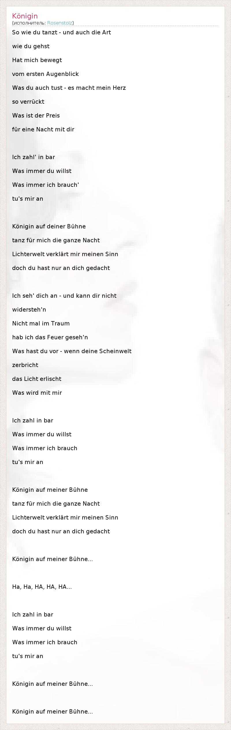 Это интересно:Rosenstolz (Розэнштольц) - музыкальный дуэт из Берлина, состоящий из вокалистки АнНы Р. (AnNa R.) и вокалиста Петера Плате (Peter Plate). Группа была основана в 1991 году в районе Берлин-Фридрихсхайн (Berlin-Friedrichshain). Песни, почти всегда на немецком языке, можно отнести к пересечению таких стилей, как поп, шансон и рок. Особенно в начале карьеры тексты группы были многозначными. В начале-середине девяностых... продолжение