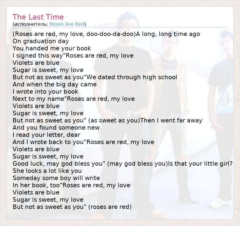 (Roses are red, my love, doo-doo-da-doo)A long, long time ago On graduation day You handed me your book I signed this way"Roses are red, my love Violets are blue Sugar is sweet, my love But not as sweet as you"We dated through high school And when the big day came I wrote into your book Next to my name"Roses are red, my love Violets are blue Sugar is sweet, my love But not as sweet as you" (as sweet as you)Then I went far away And you found someone new I read your letter, dear And I wrote back to you"Roses are red, my love Violets are blue Sugar is sweet, my love Good luck, may god bless you" (may god bless you)Is that your little girl? She looks a lot like you Someday some boy will write In her book, too"Roses are red, my love Violets are blue Sugar is sweet, my love But not as sweet as you" (roses are red)