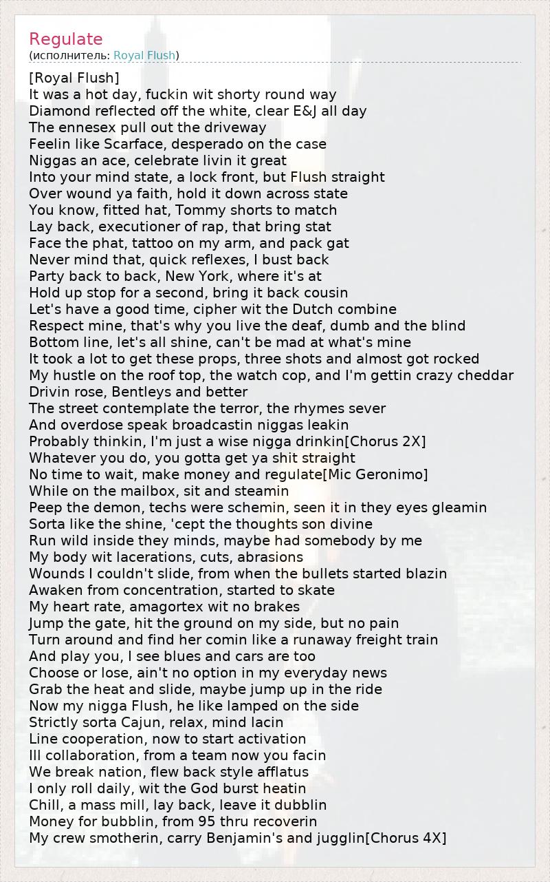 [Royal Flush] It was a hot day, fuckin wit shorty round way Diamond reflected off the white, clear E&J all day The ennesex pull out the driveway Feelin like Scarface, desperado on the case Niggas an ace, celebrate livin it great Into your mind state, a lock front, but Flush straight Over wound ya faith, hold it down across state You know, fitted hat, Tommy shorts to match Lay back, executioner of rap, that bring stat Face the phat, tattoo on my arm, and pack gat Never mind that, quick reflexes, I bust back Party back to back, New York, where it's at Hold up stop for a second, bring it back cousin Let's have a good time, cipher wit the Dutch combine Respect mine, that's why you live the deaf, dumb and the blind Bottom line, let's all shine, can't be mad at what's mine It took a lot to get these props, three shots and almost got rocked My hustle on the roof top, the watch cop, and I'm gettin crazy cheddar Drivin rose, Bentleys and better The street contemplate the terror, the rhymes sever And overdose speak broadcastin niggas leakin Probably thinkin, I'm just a wise nigga drinkin[Chorus 2X] Whatever you do, you gotta get ya shit straight No time to wait, make money and regulate[Mic Geronimo] While on the mailbox, sit and steamin Peep the demon, techs were schemin, seen it in they eyes gleamin Sorta like the shine, 'cept the thoughts son divine Run wild inside they minds, maybe had somebody by me My body wit lacerations, cuts, abrasions Wounds I couldn't slide, from when the bullets started blazin Awaken from concentration, started to skate My heart rate, amagortex wit no brakes Jump the gate, hit the ground on my side, but no pain Turn around and find her comin like a runaway freight train And play you, I see blues and cars are too Choose or lose, ain't no option in my everyday news Grab the heat and slide, maybe jump up in the ride Now my nigga Flush, he like lamped on the side Strictly sorta Cajun, relax, mind lacin Line cooperation, now to start activation Ill collaboration, from a team now you facin We break nation, flew back style afflatus I only roll daily, wit the God burst heatin Chill, a mass mill, lay back, leave it dubblin Money for bubblin, from 95 thru recoverin My crew smotherin, carry Benjamin's and jugglin[Chorus 4X]