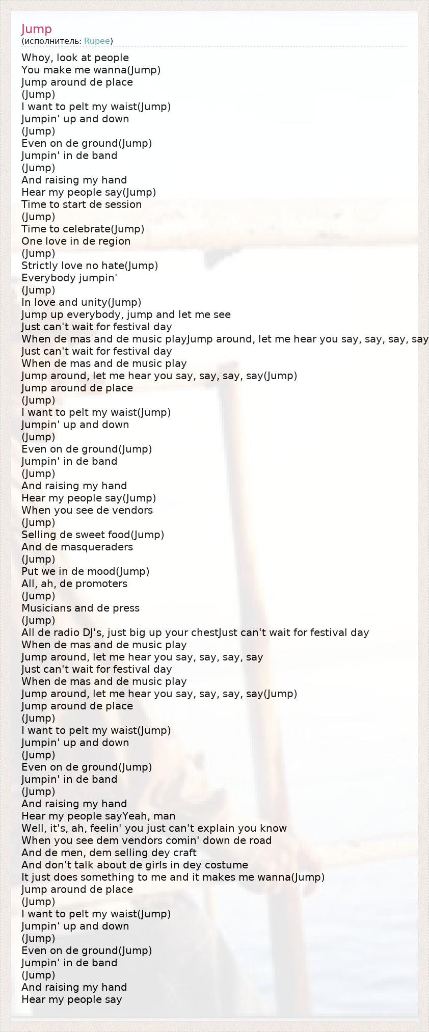 Whoy, look at people You make me wanna(Jump) Jump around de place (Jump) I want to pelt my waist(Jump) Jumpin' up and down (Jump) Even on de ground(Jump) Jumpin' in de band (Jump) And raising my hand Hear my people say(Jump) Time to start de session (Jump) Time to celebrate(Jump) One love in de region (Jump) Strictly love no hate(Jump) Everybody jumpin' (Jump) In love and unity(Jump) Jump up everybody, jump and let me see Just can't wait for festival day When de mas and de music playJump around, let me hear you say, say, say, say Just can't wait for festival day When de mas and de music play Jump around, let me hear you say, say, say, say(Jump) Jump around de place (Jump) I want to pelt my waist(Jump) Jumpin' up and down (Jump) Even on de ground(Jump) Jumpin' in de band (Jump) And raising my hand Hear my people say(Jump) When you see de vendors (Jump) Selling de sweet food(Jump) And de masqueraders (Jump) Put we in de mood(Jump) All, ah, de promoters (Jump) Musicians and de press (Jump) All de radio DJ's, just big up your chestJust can't wait for festival day When de mas and de music play Jump around, let me hear you say, say, say, say Just can't wait for festival day When de mas and de music play Jump around, let me hear you say, say, say, say(Jump) Jump around de place (Jump) I want to pelt my waist(Jump) Jumpin' up and down (Jump) Even on de ground(Jump) Jumpin' in de band (Jump) And raising my hand Hear my people sayYeah, man Well, it's, ah, feelin' you just can't explain you know When you see dem vendors comin' down de road And de men, dem selling dey craft And don't talk about de girls in dey costume It just does something to me and it makes me wanna(Jump) Jump around de place (Jump) I want to pelt my waist(Jump) Jumpin' up and down (Jump) Even on de ground(Jump) Jumpin' in de band (Jump) And raising my hand Hear my people say