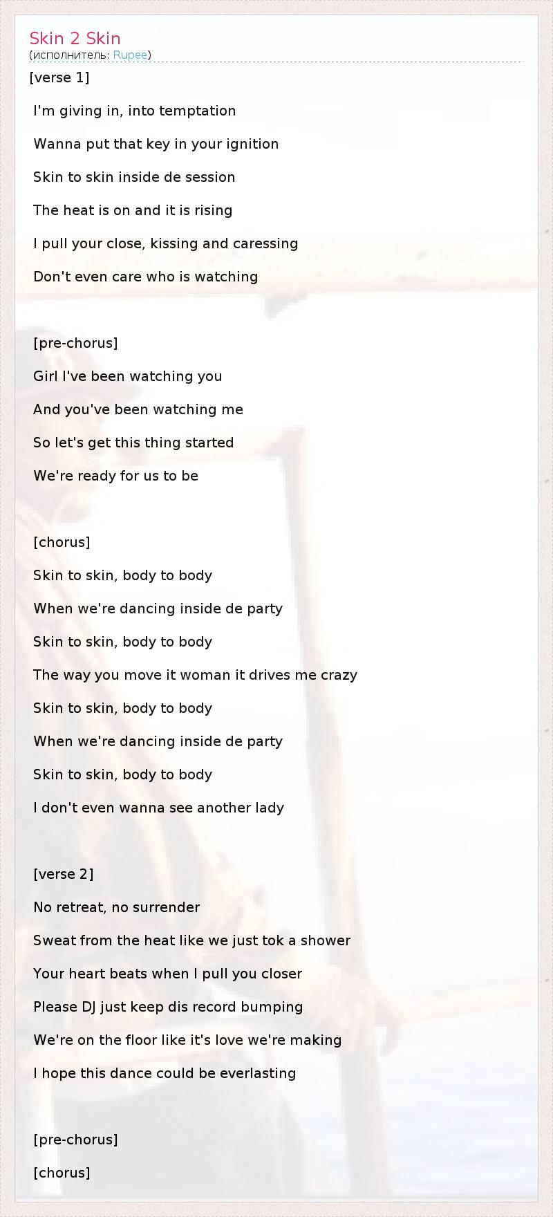 [verse 1] I'm giving in, into temptation Wanna put that key in your ignition Skin to skin inside de session The heat is on and it is rising I pull your close, kissing and caressing Don't even care who is watching [pre-chorus] Girl I've been watching you And you've been watching me So let's get this thing started We're ready for us to be [chorus] Skin to skin, body to body When we're dancing inside de party Skin to skin, body to body The way you move it woman it drives me crazy Skin to skin, body to body When we're dancing inside de party Skin to skin, body to body I don't even wanna see another lady [verse 2] No retreat, no surrender Sweat from the heat like we just tok a shower Your heart beats when I pull you closer Please DJ just keep dis record bumping We're on the floor like it's love we're making I hope this dance could be everlasting [pre-chorus] [chorus]