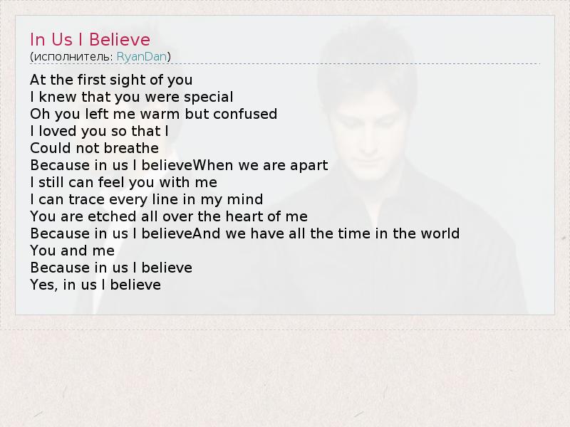 At the first sight of you I knew that you were special Oh you left me warm but confused I loved you so that I Could not breathe Because in us I believeWhen we are apart I still can feel you with me I can trace every line in my mind You are etched all over the heart of me Because in us I believeAnd we have all the time in the world You and me Because in us I believe Yes, in us I believe