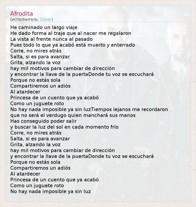 He caminado un largo viaje He dado forma al traje que al nacer me regalaron La vista al frente nunca al pasado Pues todo lo que ya acabó está muerto y enterrado Corre, no mires atrás Salta, si es para avanzar Grita, alzando la voz hay mil motivos para cambiar de dirección y encontrar la llave de la puertaDonde tu voz se escuchará Porque no estás sola Compartiremos un adiós Al atardecer Princesa de un cuento que ya acabó Como un juguete roto No hay nada imposible ya sin luzTiempos lejanos me recordaron que no será el verdugo quien manchará sus manos Has conseguido poder salir y buscar la luz del sol en cada momento frío Corre, no mires atrás Salta, si es para avanzar Grita, alzando la voz hay mil motivos para cambiar de dirección y encontrar la llave de la puertaDonde tu voz se escuchará Porque no estás sola Compartiremos un adiós Al atardecer Princesa de un cuento que ya acabó Como un juguete roto No hay nada imposible ya sin luz