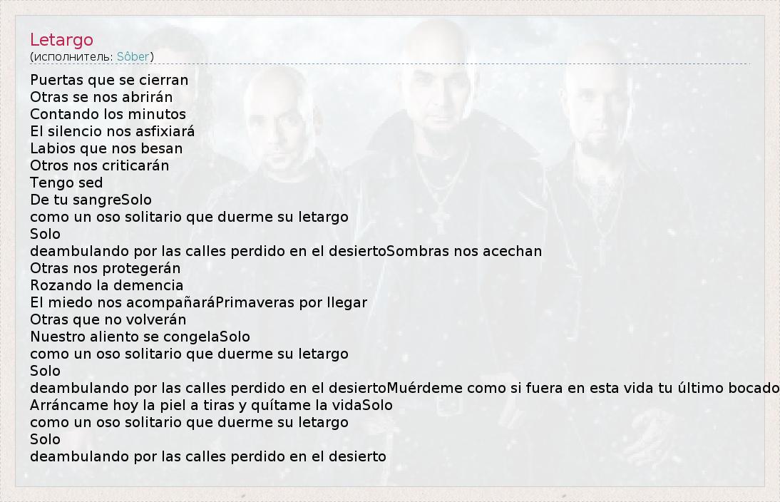 Это интересно:Sôber is an alternative rock band from Madrid, Spain, formed in 1994. Founded when Carlos Escobedo posted an advertisement in a local guitar store and was then contacted by Antonio Bernardini to start Sober Stoned. The band's line-up has primarily consisted of vocalist/bassist Carlos Escobedo, guitarists Jorge Escobedo and Antonio Bernardini, while going through a number of drummers. In 2002, with Alberto Madrid as drummer, the band released Paradÿsso. The album sold more than 100,000 copies. In 2004 they released Reddo, which sold more than 50,000 copies.On 1 January 2010, the band announced their reunion with Manu... продолжение