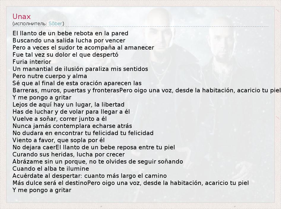 El llanto de un bebe rebota en la pared Buscando una salida lucha por vencer Pero a veces el sudor te acompaña al amanecer Fue tal vez su dolor el que despertó Furia interior Un manantial de ilusión paraliza mis sentidos Pero nutre cuerpo y alma Sé que al final de esta oración aparecen las Barreras, muros, puertas y fronterasPero oigo una voz, desde la habitación, acaricio tu piel Y me pongo a gritar Lejos de aquí hay un lugar, la libertad Has de luchar y de volar para llegar a él Vuelve a soñar, correr junto a él Nunca jamás contemplara echarse atrás No dudara en encontrar tu felicidad tu felicidad Viento a favor, que sopla por él No dejara caerEl llanto de un bebe reposa entre tu piel Curando sus heridas, lucha por crecer Abrázame sin un porque, no te olvides de seguir soñando Cuando el alba te ilumine Acuérdate al despertar: cuanto más largo el camino Más dulce será el destinoPero oigo una voz, desde la habitación, acaricio tu piel Y me pongo a gritar