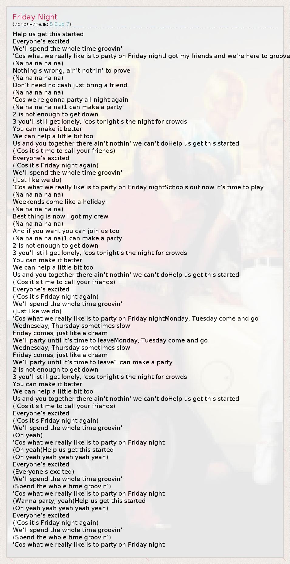 'Cos what we really like is to party on Friday nightI got my friends and we're here to groove