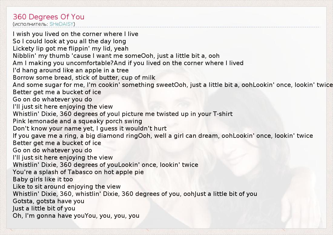 I wish you lived on the corner where I live So I could look at you all the day long Lickety lip got me flippin' my lid, yeah Nibblin' my thumb 'cause I want me someOoh, just a little bit a, ooh Am I making you uncomfortable?And if you lived on the corner where I lived I'd hang around like an apple in a tree Borrow some bread, stick of butter, cup of milk And some sugar for me, I'm cookin' something sweetOoh, just a little bit a, oohLookin' once, lookin' twice Better get me a bucket of ice Go on do whatever you do I'll just sit here enjoying the view Whistlin' Dixie, 360 degrees of youI picture me twisted up in your T-shirt Pink lemonade and a squeaky porch swing Don't know your name yet, I guess it wouldn't hurt If you gave me a ring, a big diamond ringOoh, well a girl can dream, oohLookin' once, lookin' twice Better get me a bucket of ice Go on do whatever you do I'll just sit here enjoying the view Whistlin' Dixie, 360 degrees of youLookin' once, lookin' twice You're a splash of Tabasco on hot apple pie Baby girls like it too Like to sit around enjoying the view Whistlin' Dixie, 360, whistlin' Dixie, 360 degrees of you, oohJust a little bit of you Gotsta, gotsta have you Just a little bit of you Oh, I'm gonna have youYou, you, you, you