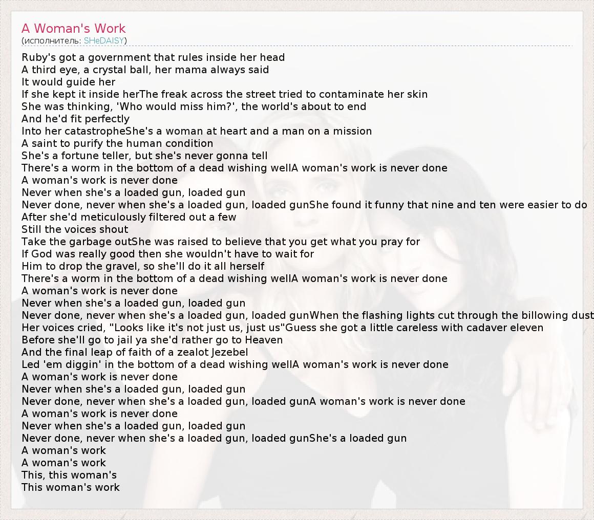 Never done, never when she's a loaded gun, loaded gunA woman's work is never done