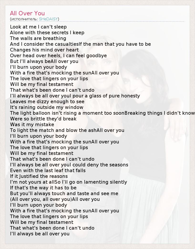 Look at me I can't sleep Alone with these secrets I keep The walls are breathing And I consider the casualtiesIf the man that you have to be Changes his mind over heart Over head over heels, I can feel goodbye But I'll always beAll over you I'll burn upon your body With a fire that's mocking the sunAll over you The love that lingers on your lips Will be my final testament That what's been done I can't undo I'll always be all over youI pour a glass of pure honesty Leaves me dizzy enough to see It's raining outside my window The light balloon isn't rising a moment too soonBreaking things I didn't know Were so brittle they'd break Was it my mistake To light the match and blow the ashAll over you I'll burn upon your body With a fire that's mocking the sunAll over you The love that lingers on your lips Will be my final testament That what's been done I can't undo I'll always be all over youI could deny the seasons Even with the last leaf that falls If it Justified the reasons I'm not yours at allSo I'll go on lamenting silently If that's the way it has to be But you'll always touch and taste and see me (All over you, all over you)All over you I'll burn upon your body With a fire that's mocking the sunAll over you The love that lingers on your lips Will be my final testament That what's been done I can't undo I'll always be all over you