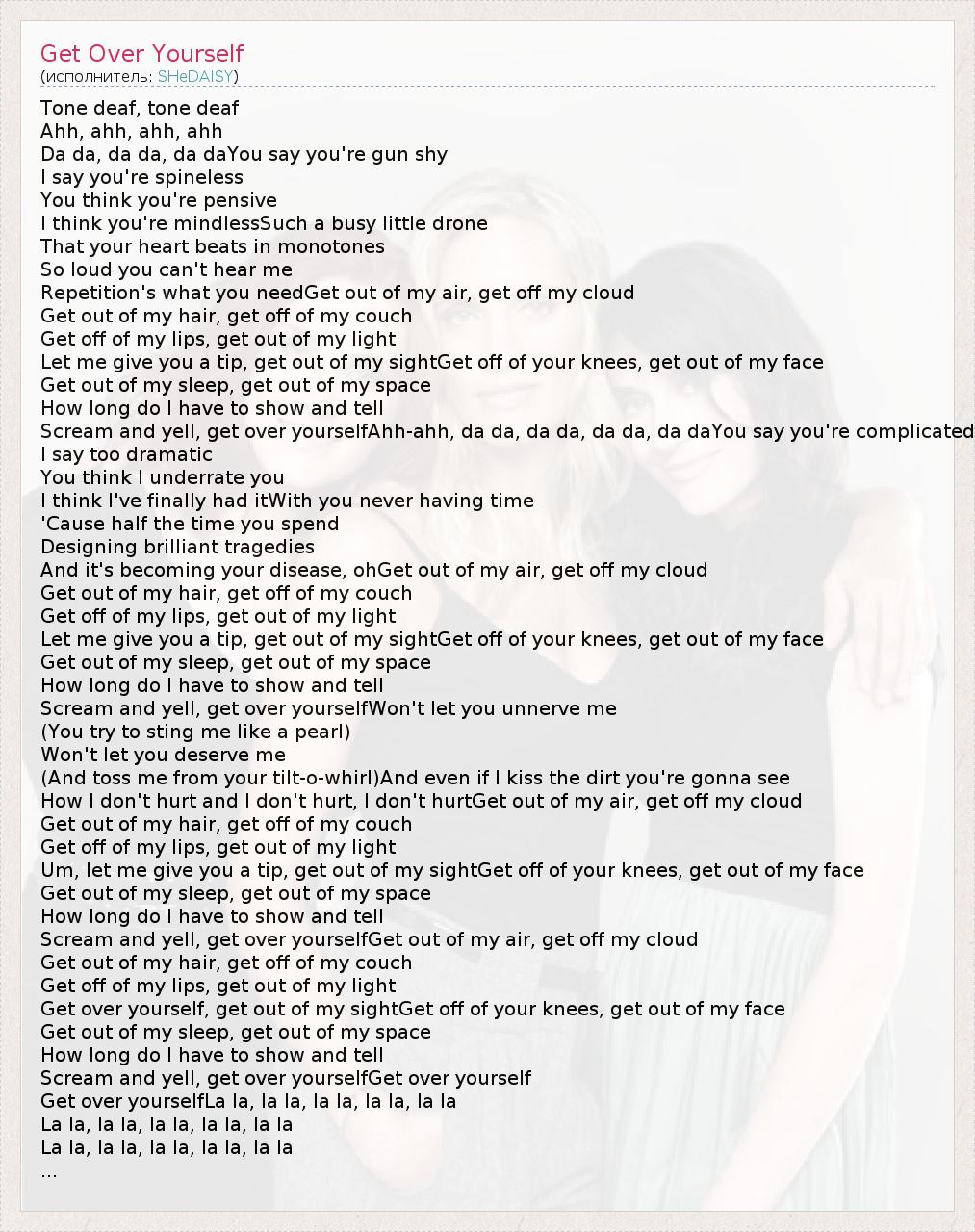 Tone deaf, tone deaf Ahh, ahh, ahh, ahh Da da, da da, da daYou say you're gun shy I say you're spineless You think you're pensive I think you're mindlessSuch a busy little drone That your heart beats in monotones So loud you can't hear me Repetition's what you needGet out of my air, get off my cloud Get out of my hair, get off of my couch Get off of my lips, get out of my light Let me give you a tip, get out of my sightGet off of your knees, get out of my face Get out of my sleep, get out of my space How long do I have to show and tell Scream and yell, get over yourselfAhh-ahh, da da, da da, da da, da daYou say you're complicated I say too dramatic You think I underrate you I think I've finally had itWith you never having time 'Cause half the time you spend Designing brilliant tragedies And it's becoming your disease, ohGet out of my air, get off my cloud Get out of my hair, get off of my couch Get off of my lips, get out of my light Let me give you a tip, get out of my sightGet off of your knees, get out of my face Get out of my sleep, get out of my space How long do I have to show and tell Scream and yell, get over yourselfWon't let you unnerve me (You try to sting me like a pearl) Won't let you deserve me (And toss me from your tilt-o-whirl)And even if I kiss the dirt you're gonna see How I don't hurt and I don't hurt, I don't hurtGet out of my air, get off my cloud Get out of my hair, get off of my couch Get off of my lips, get out of my light Um, let me give you a tip, get out of my sightGet off of your knees, get out of my face Get out of my sleep, get out of my space How long do I have to show and tell Scream and yell, get over yourselfGet out of my air, get off my cloud Get out of my hair, get off of my couch Get off of my lips, get out of my light Get over yourself, get out of my sightGet off of your knees, get out of my face Get out of my sleep, get out of my space How long do I have to show and tell Scream and yell, get over yourselfGet over yourself Get over yourselfLa la, la la, la la, la la, la la La la, la la, la la, la la, la la La la, la la, la la, la la, la la ...
