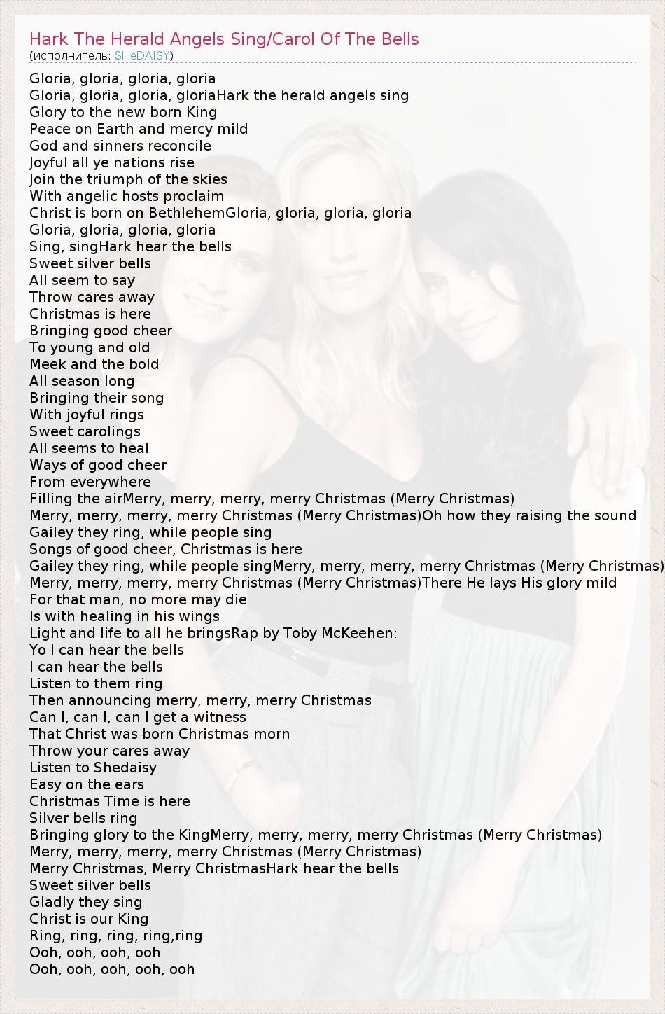 Gloria, gloria, gloria, gloria Gloria, gloria, gloria, gloriaHark the herald angels sing Glory to the new born King Peace on Earth and mercy mild God and sinners reconcile Joyful all ye nations rise Join the triumph of the skies With angelic hosts proclaim Christ is born on BethlehemGloria, gloria, gloria, gloria Gloria, gloria, gloria, gloria Sing, singHark hear the bells Sweet silver bells All seem to say Throw cares away Christmas is here Bringing good cheer To young and old Meek and the bold All season long Bringing their song With joyful rings Sweet carolings All seems to heal Ways of good cheer From everywhere Filling the airMerry, merry, merry, merry Christmas (Merry Christmas) Merry, merry, merry, merry Christmas (Merry Christmas)Oh how they raising the sound Gailey they ring, while people sing Songs of good cheer, Christmas is here Gailey they ring, while people singMerry, merry, merry, merry Christmas (Merry Christmas) Merry, merry, merry, merry Christmas (Merry Christmas)There He lays His glory mild For that man, no more may die Is with healing in his wings Light and life to all he bringsRap by Toby McKeehen: Yo I can hear the bells I can hear the bells Listen to them ring Then announcing merry, merry, merry Christmas Can I, can I, can I get a witness That Christ was born Christmas morn Throw your cares away Listen to Shedaisy Easy on the ears Christmas Time is here Silver bells ring Bringing glory to the KingMerry, merry, merry, merry Christmas (Merry Christmas) Merry, merry, merry, merry Christmas (Merry Christmas) Merry Christmas, Merry ChristmasHark hear the bells Sweet silver bells Gladly they sing Christ is our King Ring, ring, ring, ring,ring Ooh, ooh, ooh, ooh Ooh, ooh, ooh, ooh, ooh