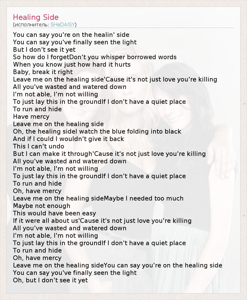 You can say you're on the healin' side You can say you've finally seen the light But I don't see it yet So how do I forgetDon't you whisper borrowed words When you know just how hard it hurts Baby, break it right Leave me on the healing side'Cause it's not just love you're killing All you've wasted and watered down I'm not able, I'm not willing To just lay this in the groundIf I don't have a quiet place To run and hide Have mercy Leave me on the healing side Oh, the healing sideI watch the blue folding into black And if I could I wouldn't give it back This I can't undo But I can make it through'Cause it's not just love you're killing All you've wasted and watered down I'm not able, I'm not willing To just lay this in the groundIf I don't have a quiet place To run and hide Oh, have mercy Leave me on the healing sideMaybe I needed too much Maybe not enough This would have been easy If it were all about us'Cause it's not just love you're killing All you've wasted and watered down I'm not able, I'm not willing To just lay this in the groundIf I don't have a quiet place To run and hide Oh, have mercy Leave me on the healing sideYou can say you're on the healing side You can say you've finally seen the light Oh, but I don't see it yet