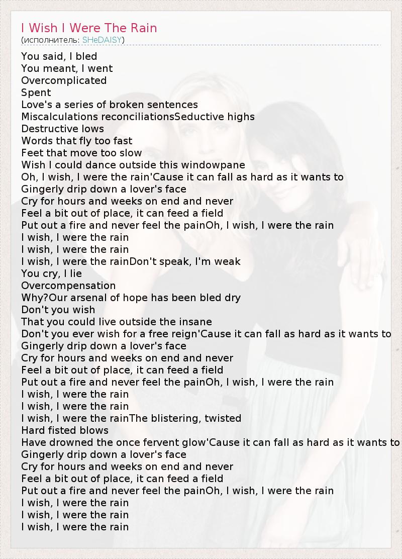 You said, I bled You meant, I went Overcomplicated Spent Love's a series of broken sentences Miscalculations reconciliationsSeductive highs Destructive lows Words that fly too fast Feet that move too slow Wish I could dance outside this windowpane Oh, I wish, I were the rain'Cause it can fall as hard as it wants to Gingerly drip down a lover's face Cry for hours and weeks on end and never Feel a bit out of place, it can feed a field Put out a fire and never feel the painOh, I wish, I were the rain I wish, I were the rain I wish, I were the rain I wish, I were the rainDon't speak, I'm weak You cry, I lie Overcompensation Why?Our arsenal of hope has been bled dry Don't you wish That you could live outside the insane Don't you ever wish for a free reign'Cause it can fall as hard as it wants to Gingerly drip down a lover's face Cry for hours and weeks on end and never Feel a bit out of place, it can feed a field Put out a fire and never feel the painOh, I wish, I were the rain I wish, I were the rain I wish, I were the rain I wish, I were the rainThe blistering, twisted Hard fisted blows Have drowned the once fervent glow'Cause it can fall as hard as it wants to Gingerly drip down a lover's face Cry for hours and weeks on end and never Feel a bit out of place, it can feed a field Put out a fire and never feel the painOh, I wish, I were the rain I wish, I were the rain I wish, I were the rain I wish, I were the rain