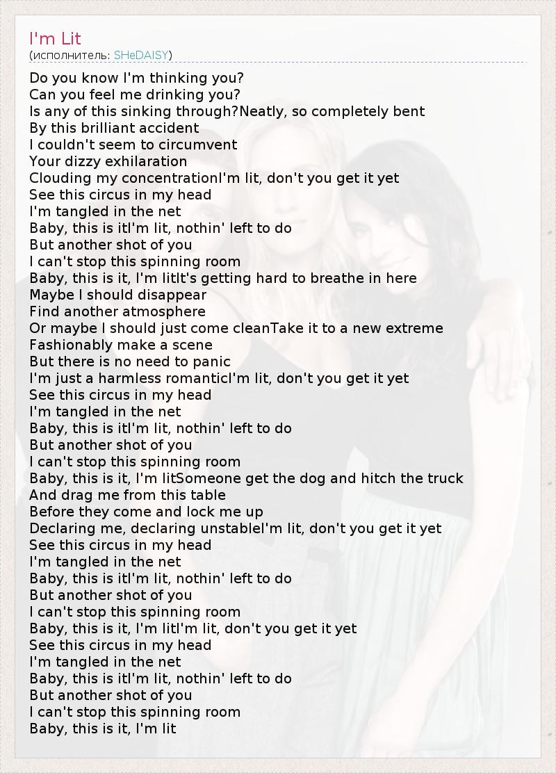 Do you know I'm thinking you? Can you feel me drinking you? Is any of this sinking through?Neatly, so completely bent By this brilliant accident I couldn't seem to circumvent Your dizzy exhilaration Clouding my concentrationI'm lit, don't you get it yet See this circus in my head I'm tangled in the net Baby, this is itI'm lit, nothin' left to do But another shot of you I can't stop this spinning room Baby, this is it, I'm litIt's getting hard to breathe in here Maybe I should disappear Find another atmosphere Or maybe I should just come cleanTake it to a new extreme Fashionably make a scene But there is no need to panic I'm just a harmless romanticI'm lit, don't you get it yet See this circus in my head I'm tangled in the net Baby, this is itI'm lit, nothin' left to do But another shot of you I can't stop this spinning room Baby, this is it, I'm litSomeone get the dog and hitch the truck And drag me from this table Before they come and lock me up Declaring me, declaring unstableI'm lit, don't you get it yet See this circus in my head I'm tangled in the net Baby, this is itI'm lit, nothin' left to do But another shot of you I can't stop this spinning room Baby, this is it, I'm litI'm lit, don't you get it yet See this circus in my head I'm tangled in the net Baby, this is itI'm lit, nothin' left to do But another shot of you I can't stop this spinning room Baby, this is it, I'm lit