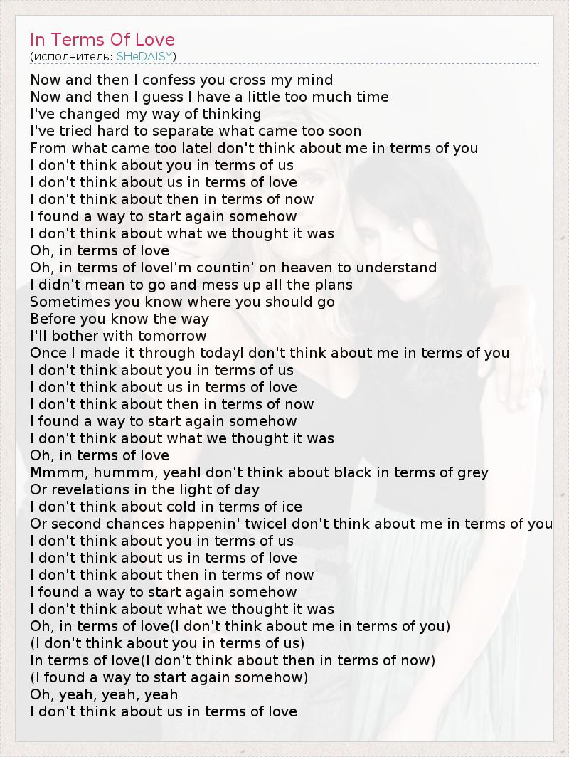 Now and then I confess you cross my mind Now and then I guess I have a little too much time I've changed my way of thinking I've tried hard to separate what came too soon From what came too lateI don't think about me in terms of you I don't think about you in terms of us I don't think about us in terms of love I don't think about then in terms of now I found a way to start again somehow I don't think about what we thought it was Oh, in terms of love Oh, in terms of loveI'm countin' on heaven to understand I didn't mean to go and mess up all the plans Sometimes you know where you should go Before you know the way I'll bother with tomorrow Once I made it through todayI don't think about me in terms of you I don't think about you in terms of us I don't think about us in terms of love I don't think about then in terms of now I found a way to start again somehow I don't think about what we thought it was Oh, in terms of love Mmmm, hummm, yeahI don't think about black in terms of grey Or revelations in the light of day I don't think about cold in terms of ice Or second chances happenin' twiceI don't think about me in terms of you I don't think about you in terms of us I don't think about us in terms of love I don't think about then in terms of now I found a way to start again somehow I don't think about what we thought it was Oh, in terms of love(I don't think about me in terms of you) (I don't think about you in terms of us) In terms of love(I don't think about then in terms of now) (I found a way to start again somehow) Oh, yeah, yeah, yeah I don't think about us in terms of love
