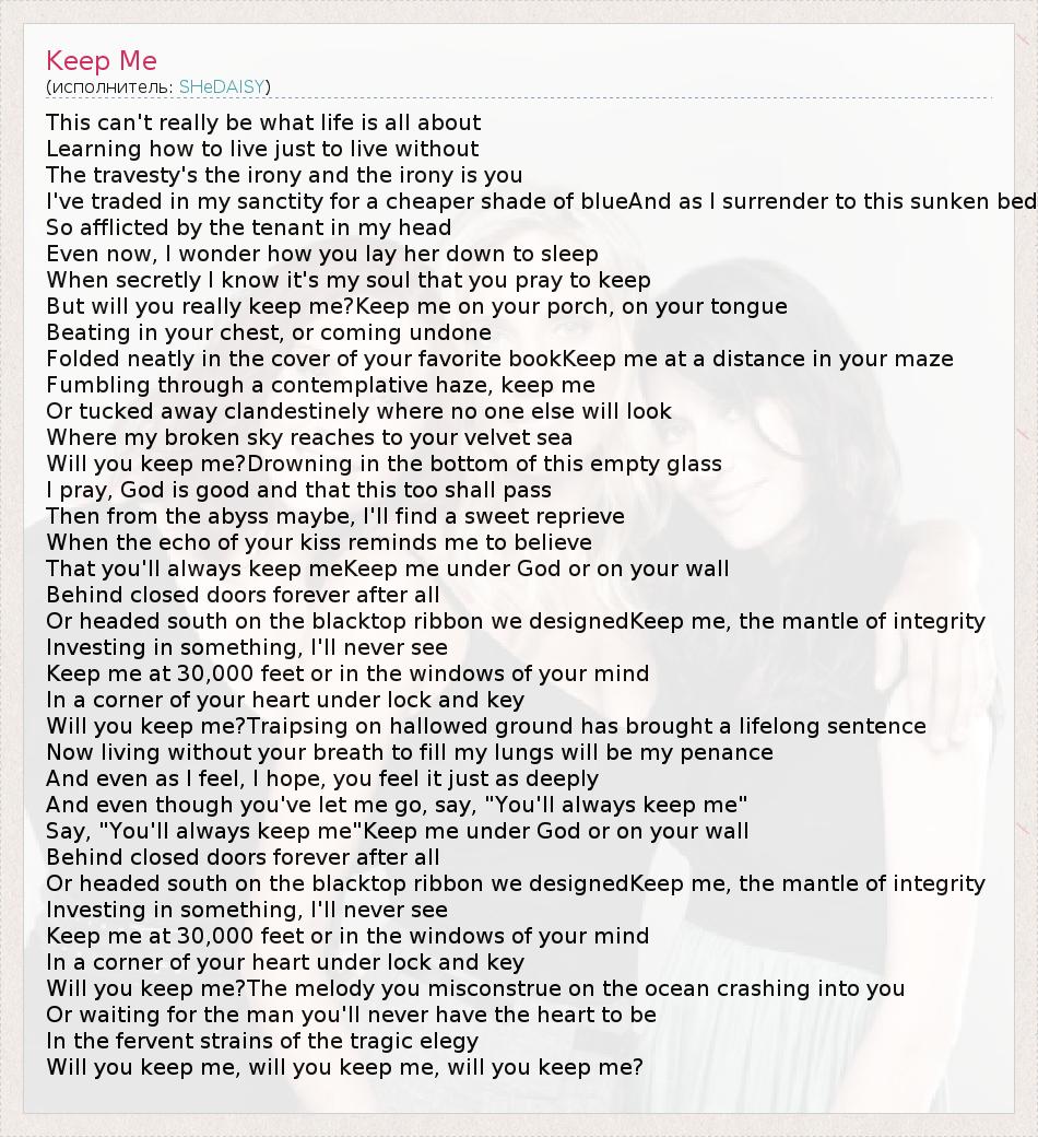 This can't really be what life is all about Learning how to live just to live without The travesty's the irony and the irony is you I've traded in my sanctity for a cheaper shade of blueAnd as I surrender to this sunken bed So afflicted by the tenant in my head Even now, I wonder how you lay her down to sleep When secretly I know it's my soul that you pray to keep But will you really keep me?Keep me on your porch, on your tongue Beating in your chest, or coming undone Folded neatly in the cover of your favorite bookKeep me at a distance in your maze Fumbling through a contemplative haze, keep me Or tucked away clandestinely where no one else will look Where my broken sky reaches to your velvet sea Will you keep me?Drowning in the bottom of this empty glass I pray, God is good and that this too shall pass Then from the abyss maybe, I'll find a sweet reprieve When the echo of your kiss reminds me to believe That you'll always keep meKeep me under God or on your wall Behind closed doors forever after all Or headed south on the blacktop ribbon we designedKeep me, the mantle of integrity Investing in something, I'll never see Keep me at 30,000 feet or in the windows of your mind In a corner of your heart under lock and key Will you keep me?Traipsing on hallowed ground has brought a lifelong sentence Now living without your breath to fill my lungs will be my penance And even as I feel, I hope, you feel it just as deeply And even though you've let me go, say, "You'll always keep me" Say, "You'll always keep me"Keep me under God or on your wall Behind closed doors forever after all Or headed south on the blacktop ribbon we designedKeep me, the mantle of integrity Investing in something, I'll never see Keep me at 30,000 feet or in the windows of your mind In a corner of your heart under lock and key Will you keep me?The melody you misconstrue on the ocean crashing into you Or waiting for the man you'll never have the heart to be In the fervent strains of the tragic elegy Will you keep me, will you keep me, will you keep me?