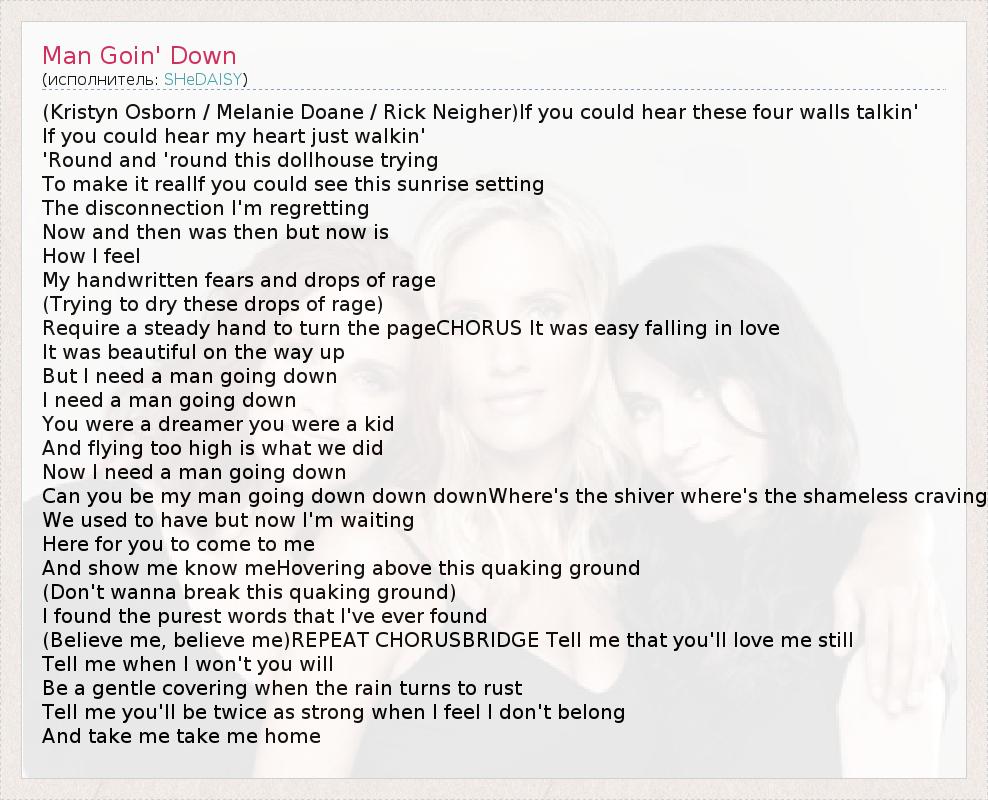 (Kristyn Osborn / Melanie Doane / Rick Neigher)If you could hear these four walls talkin' If you could hear my heart just walkin' 'Round and 'round this dollhouse trying To make it realIf you could see this sunrise setting The disconnection I'm regretting Now and then was then but now is How I feel My handwritten fears and drops of rage (Trying to dry these drops of rage) Require a steady hand to turn the pageCHORUS It was easy falling in love It was beautiful on the way up But I need a man going down I need a man going down You were a dreamer you were a kid And flying too high is what we did Now I need a man going down Can you be my man going down down downWhere's the shiver where's the shameless craving We used to have but now I'm waiting Here for you to come to me And show me know meHovering above this quaking ground (Don't wanna break this quaking ground) I found the purest words that I've ever found (Believe me, believe me)REPEAT CHORUSBRIDGE Tell me that you'll love me still Tell me when I won't you will Be a gentle covering when the rain turns to rust Tell me you'll be twice as strong when I feel I don't belong And take me take me home
