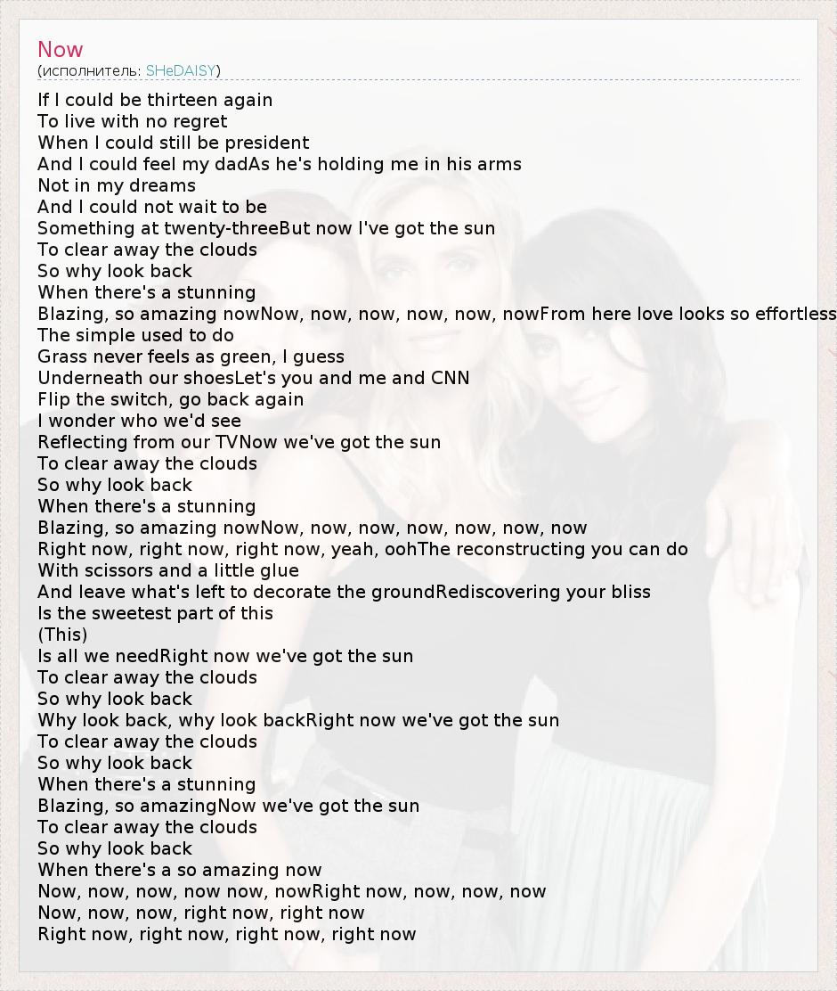 If I could be thirteen again To live with no regret When I could still be president And I could feel my dadAs he's holding me in his arms Not in my dreams And I could not wait to be Something at twenty-threeBut now I've got the sun To clear away the clouds So why look back When there's a stunning Blazing, so amazing nowNow, now, now, now, now, nowFrom here love looks so effortless The simple used to do Grass never feels as green, I guess Underneath our shoesLet's you and me and CNN Flip the switch, go back again I wonder who we'd see Reflecting from our TVNow we've got the sun To clear away the clouds So why look back When there's a stunning Blazing, so amazing nowNow, now, now, now, now, now, now Right now, right now, right now, yeah, oohThe reconstructing you can do With scissors and a little glue And leave what's left to decorate the groundRediscovering your bliss Is the sweetest part of this (This) Is all we needRight now we've got the sun To clear away the clouds So why look back Why look back, why look backRight now we've got the sun To clear away the clouds So why look back When there's a stunning Blazing, so amazingNow we've got the sun To clear away the clouds So why look back When there's a so amazing now Now, now, now, now now, nowRight now, now, now, now Now, now, now, right now, right now Right now, right now, right now, right now