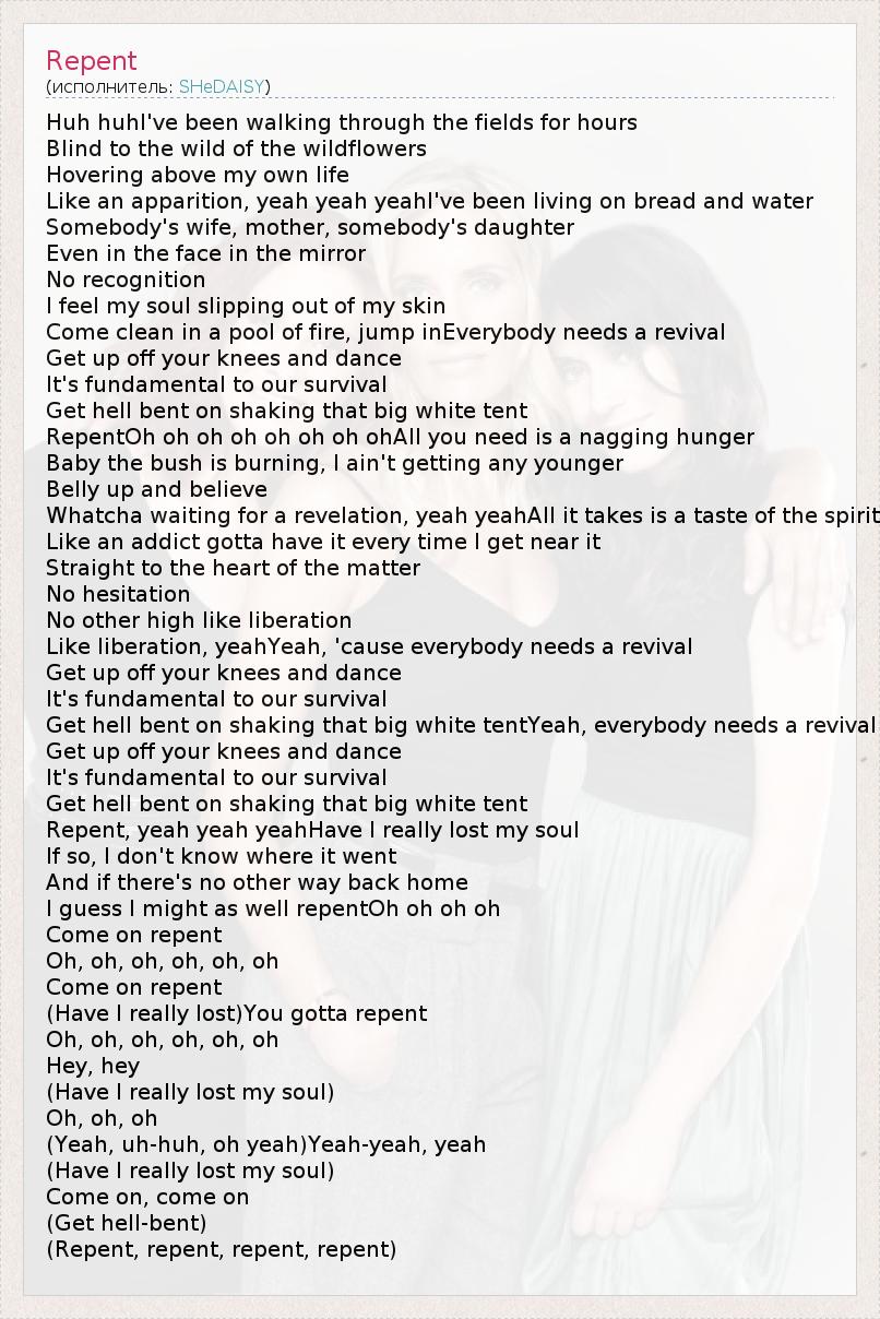 Huh huhI've been walking through the fields for hours Blind to the wild of the wildflowers Hovering above my own life Like an apparition, yeah yeah yeahI've been living on bread and water Somebody's wife, mother, somebody's daughter Even in the face in the mirror No recognition I feel my soul slipping out of my skin Come clean in a pool of fire, jump inEverybody needs a revival Get up off your knees and dance It's fundamental to our survival Get hell bent on shaking that big white tent RepentOh oh oh oh oh oh oh ohAll you need is a nagging hunger Baby the bush is burning, I ain't getting any younger Belly up and believe Whatcha waiting for a revelation, yeah yeahAll it takes is a taste of the spirit Like an addict gotta have it every time I get near it Straight to the heart of the matter No hesitation No other high like liberation Like liberation, yeahYeah, 'cause everybody needs a revival Get up off your knees and dance It's fundamental to our survival Get hell bent on shaking that big white tentYeah, everybody needs a revival Get up off your knees and dance It's fundamental to our survival Get hell bent on shaking that big white tent Repent, yeah yeah yeahHave I really lost my soul If so, I don't know where it went And if there's no other way back home I guess I might as well repentOh oh oh oh Come on repent Oh, oh, oh, oh, oh, oh Come on repent (Have I really lost)You gotta repent Oh, oh, oh, oh, oh, oh Hey, hey (Have I really lost my soul) Oh, oh, oh (Yeah, uh-huh, oh yeah)Yeah-yeah, yeah (Have I really lost my soul) Come on, come on (Get hell-bent) (Repent, repent, repent, repent)