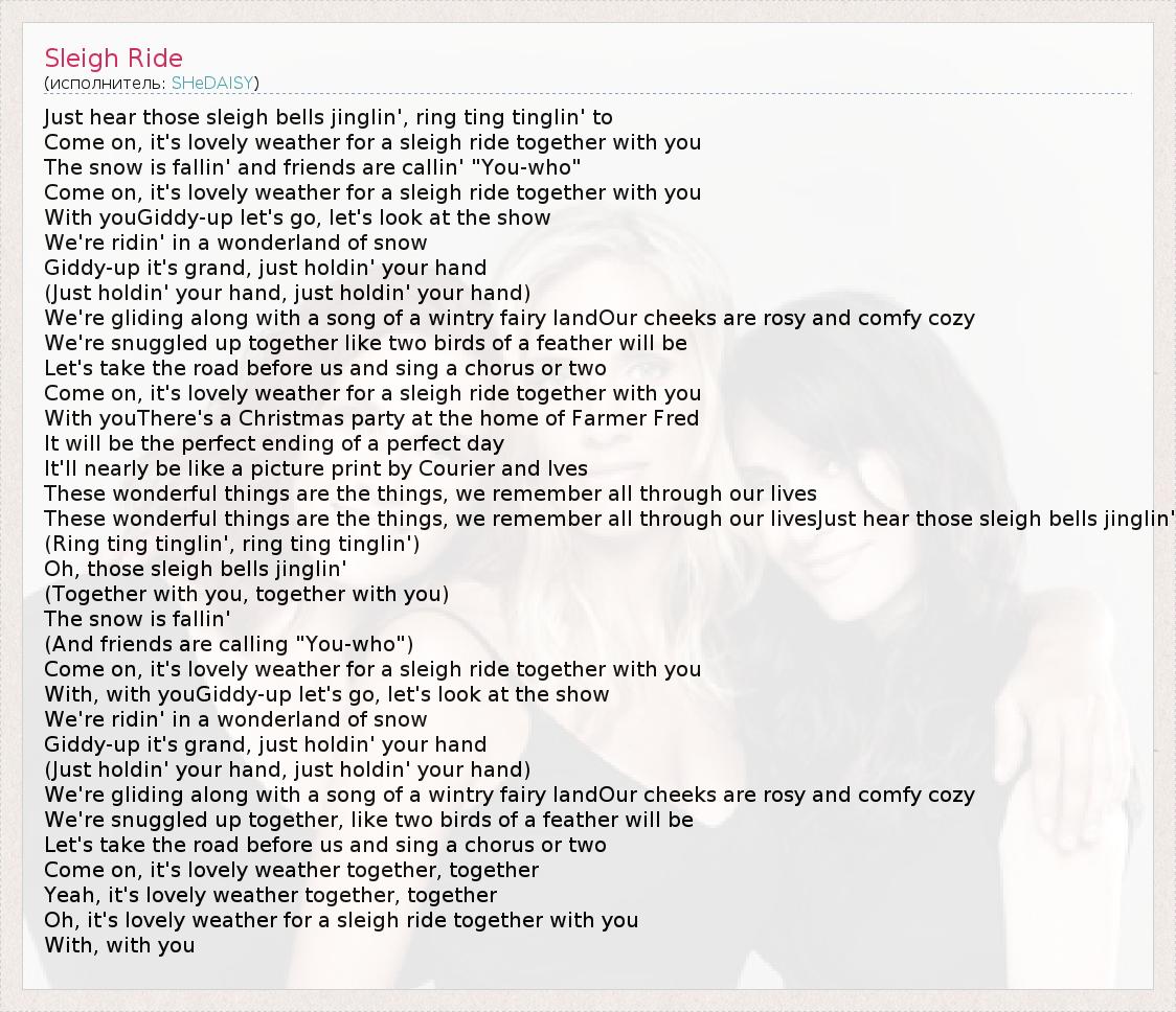 Just hear those sleigh bells jinglin', ring ting tinglin' to Come on, it's lovely weather for a sleigh ride together with you The snow is fallin' and friends are callin' "You-who" Come on, it's lovely weather for a sleigh ride together with you With youGiddy-up let's go, let's look at the show We're ridin' in a wonderland of snow Giddy-up it's grand, just holdin' your hand (Just holdin' your hand, just holdin' your hand) We're gliding along with a song of a wintry fairy landOur cheeks are rosy and comfy cozy We're snuggled up together like two birds of a feather will be Let's take the road before us and sing a chorus or two Come on, it's lovely weather for a sleigh ride together with you With youThere's a Christmas party at the home of Farmer Fred It will be the perfect ending of a perfect day It'll nearly be like a picture print by Courier and Ives These wonderful things are the things, we remember all through our lives These wonderful things are the things, we remember all through our livesJust hear those sleigh bells jinglin' (Ring ting tinglin', ring ting tinglin') Oh, those sleigh bells jinglin' (Together with you, together with you) The snow is fallin' (And friends are calling "You-who") Come on, it's lovely weather for a sleigh ride together with you With, with youGiddy-up let's go, let's look at the show We're ridin' in a wonderland of snow Giddy-up it's grand, just holdin' your hand (Just holdin' your hand, just holdin' your hand) We're gliding along with a song of a wintry fairy landOur cheeks are rosy and comfy cozy We're snuggled up together, like two birds of a feather will be Let's take the road before us and sing a chorus or two Come on, it's lovely weather together, together Yeah, it's lovely weather together, together Oh, it's lovely weather for a sleigh ride together with you With, with you
