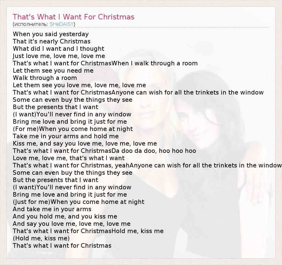 When you said yesterday That it's nearly Christmas What did I want and I thought Just love me, love me, love me That's what I want for ChristmasWhen I walk through a room Let them see you need me Walk through a room Let them see you love me, love me, love me That's what I want for ChristmasAnyone can wish for all the trinkets in the window Some can even buy the things they see But the presents that I want (I want)You'll never find in any window Bring me love and bring it just for me (For me)When you come home at night Take me in your arms and hold me Kiss me, and say you love me, love me, love me That's what I want for ChristmasDa doo da doo, hoo hoo hoo Love me, love me, that's what I want That's what I want for Christmas, yeahAnyone can wish for all the trinkets in the window Some can even buy the things they see But the presents that I want (I want)You'll never find in any window Bring me love and bring it just for me (Just for me)When you come home at night And take me in your arms And you hold me, and you kiss me And say you love me, love me, love me That's what I want for ChristmasHold me, kiss me (Hold me, kiss me) That's what I want for Christmas