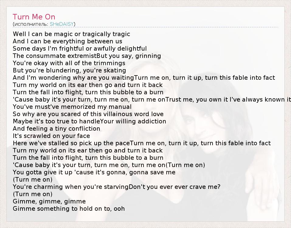 Well I can be magic or tragically tragic And I can be everything between us Some days I'm frightful or awfully delightful The consummate extremistBut you say, grinning You're okay with all of the trimmings But you're blundering, you're skating And I'm wondering why are you waitingTurn me on, turn it up, turn this fable into fact Turn my world on its ear then go and turn it back Turn the fall into flight, turn this bubble to a burn 'Cause baby it's your turn, turn me on, turn me onTrust me, you own it I've always known it You've must've memorized my manual So why are you scared of this villainous word love Maybe it's too true to handleYour willing addiction And feeling a tiny confliction It's scrawled on your face Here we've stalled so pick up the paceTurn me on, turn it up, turn this fable into fact Turn my world on its ear then go and turn it back Turn the fall into flight, turn this bubble to a burn 'Cause baby it's your turn, turn me on, turn me on(Turn me on) You gotta give it up 'cause it's gonna, gonna save me (Turn me on) You're charming when you're starvingDon't you ever ever crave me? (Turn me on) Gimme, gimme, gimme Gimme something to hold on to, ooh