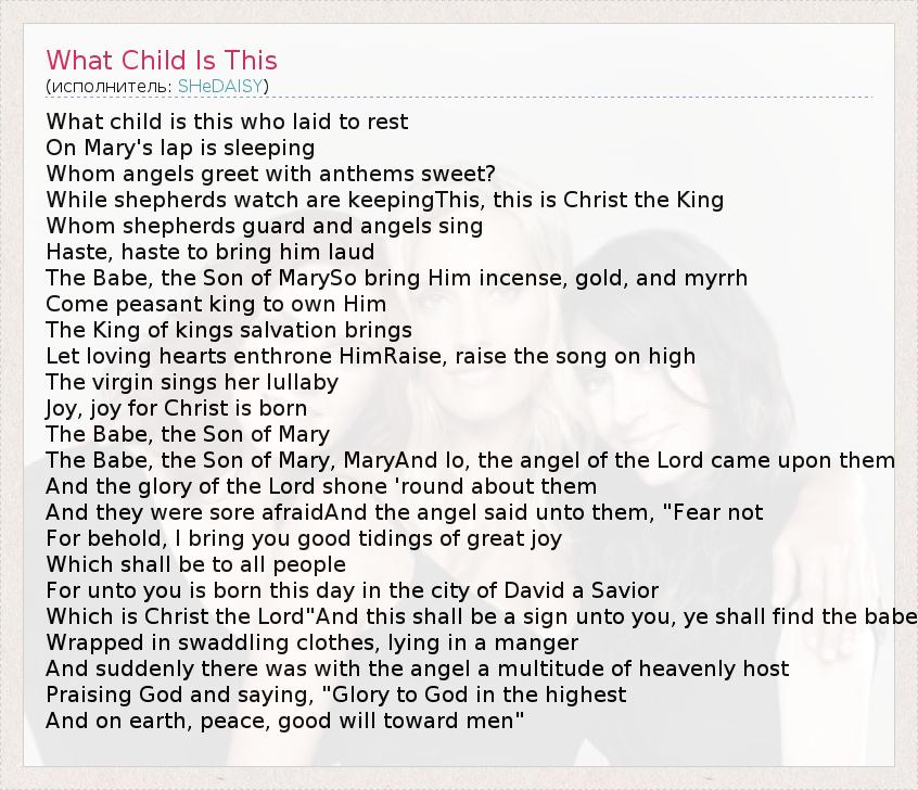 What child is this who laid to rest On Mary's lap is sleeping Whom angels greet with anthems sweet? While shepherds watch are keepingThis, this is Christ the King Whom shepherds guard and angels sing Haste, haste to bring him laud The Babe, the Son of MarySo bring Him incense, gold, and myrrh Come peasant king to own Him The King of kings salvation brings Let loving hearts enthrone HimRaise, raise the song on high The virgin sings her lullaby Joy, joy for Christ is born The Babe, the Son of Mary The Babe, the Son of Mary, MaryAnd lo, the angel of the Lord came upon them And the glory of the Lord shone 'round about them And they were sore afraidAnd the angel said unto them, "Fear not For behold, I bring you good tidings of great joy Which shall be to all people For unto you is born this day in the city of David a Savior Which is Christ the Lord"And this shall be a sign unto you, ye shall find the babe Wrapped in swaddling clothes, lying in a manger And suddenly there was with the angel a multitude of heavenly host Praising God and saying, "Glory to God in the highest And on earth, peace, good will toward men"