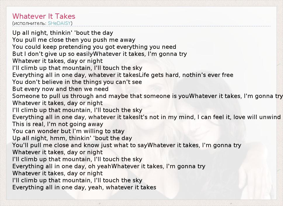 Up all night, thinkin' 'bout the day You pull me close then you push me away You could keep pretending you got everything you need But I don't give up so easilyWhatever it takes, I'm gonna try Whatever it takes, day or night I'll climb up that mountain, I'll touch the sky Everything all in one day, whatever it takesLife gets hard, nothin's ever free You don't believe in the things you can't see But every now and then we need Someone to pull us through and maybe that someone is youWhatever it takes, I'm gonna try Whatever it takes, day or night I'll climb up that mountain, I'll touch the sky Everything all in one day, whatever it takesIt's not in my mind, I can feel it, love will unwind This is real, I'm not going away You can wonder but I'm willing to stay Up all night, hmm, thinkin' 'bout the day You'll pull me close and know just what to sayWhatever it takes, I'm gonna try Whatever it takes, day or night I'll climb up that mountain, I'll touch the sky Everything all in one day, oh yeahWhatever it takes, I'm gonna try Whatever it takes, day or night I'll climb up that mountain, I'll touch the sky Everything all in one day, yeah, whatever it takes