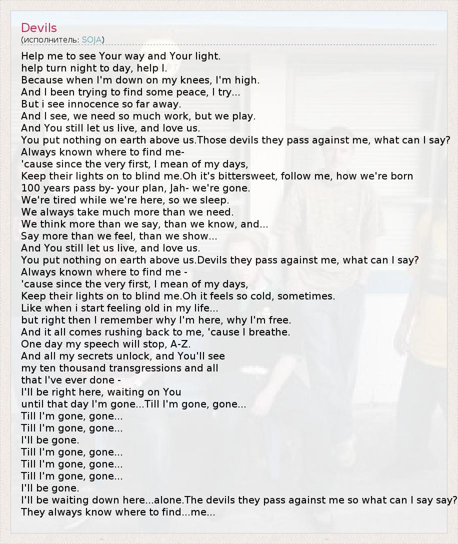 Help me to see Your way and Your light. help turn night to day, help I. Because when I'm down on my knees, I'm high. And I been trying to find some peace, I try... But i see innocence so far away. And I see, we need so much work, but we play. And You still let us live, and love us. You put nothing on earth above us.Those devils they pass against me, what can I say? Always known where to find me- 'cause since the very first, I mean of my days, Keep their lights on to blind me.Oh it's bittersweet, follow me, how we're born 100 years pass by- your plan, Jah- we're gone. We're tired while we're here, so we sleep. We always take much more than we need. We think more than we say, than we know, and... Say more than we feel, than we show... And You still let us live, and love us. You put nothing on earth above us.Devils they pass against me, what can I say? Always known where to find me - 'cause since the very first, I mean of my days, Keep their lights on to blind me.Oh it feels so cold, sometimes. Like when i start feeling old in my life... but right then I remember why I'm here, why I'm free. And it all comes rushing back to me, 'cause I breathe. One day my speech will stop, A-Z. And all my secrets unlock, and You'll see my ten thousand transgressions and all that I've ever done - I'll be right here, waiting on You until that day I'm gone...Till I'm gone, gone... Till I'm gone, gone... Till I'm gone, gone... I'll be gone. Till I'm gone, gone... Till I'm gone, gone... Till I'm gone, gone... I'll be gone. I'll be waiting down here...alone.The devils they pass against me so what can I say say? They always know where to find...me...