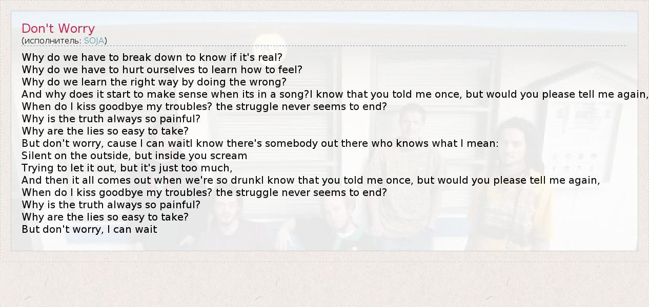 Это интересно:Soldiers of Jah Army (SOJA) — регги-коллектив, базирующейся в Арлингтоне, штат Виргиния в районе Вашингтона, округ Колумбия. Запуск в качестве активной группы в 1997 году, их музыка выпускается под лейблом Innerloop.Дискография * Soldiers of Jah Army (2000) * Peace in a Time of War (2003) * Dub in a Time of War (2005) * Get Wiser (2006) текст песен * Get Wiser Live DVD (2007) * Stars & Stripes EP (2008) * Born In Babylon (2009) * Strength... продолжение