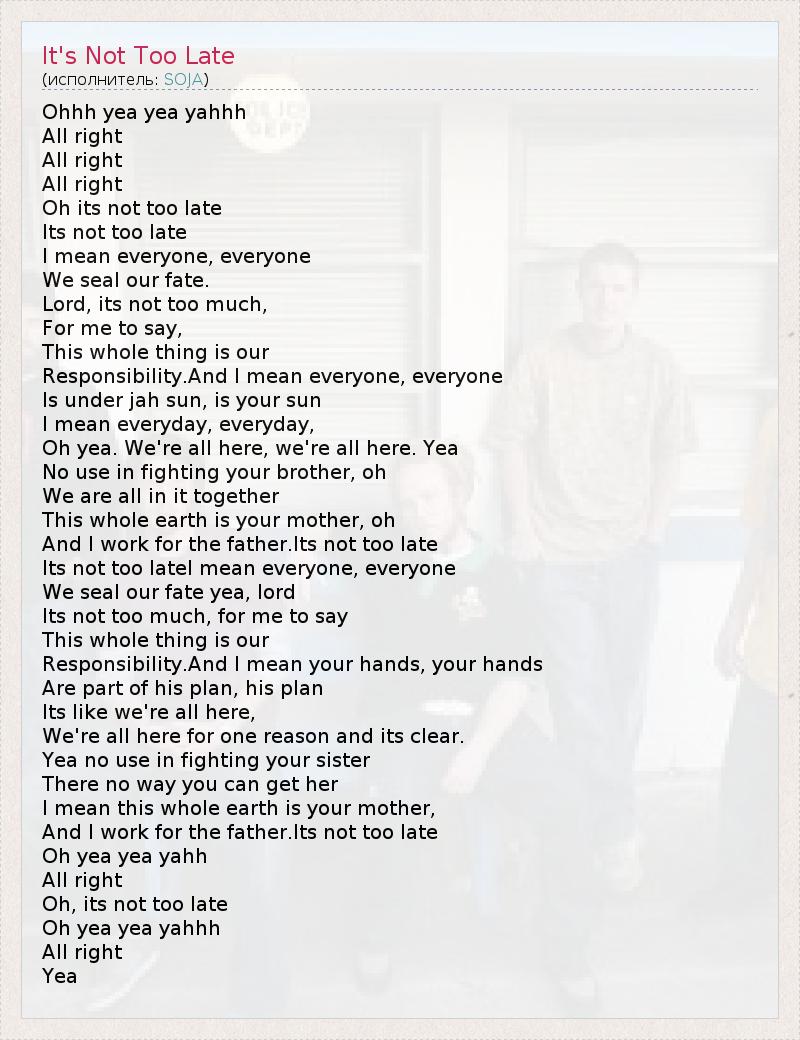 Ohhh yea yea yahhh All right All right All right Oh its not too late Its not too late I mean everyone, everyone We seal our fate. Lord, its not too much, For me to say, This whole thing is our Responsibility.And I mean everyone, everyone Is under jah sun, is your sun I mean everyday, everyday, Oh yea. We're all here, we're all here. Yea No use in fighting your brother, oh We are all in it together This whole earth is your mother, oh And I work for the father.Its not too late Its not too lateI mean everyone, everyone We seal our fate yea, lord Its not too much, for me to say This whole thing is our Responsibility.And I mean your hands, your hands Are part of his plan, his plan Its like we're all here, We're all here for one reason and its clear. Yea no use in fighting your sister There no way you can get her I mean this whole earth is your mother, And I work for the father.Its not too late Oh yea yea yahh All right Oh, its not too late Oh yea yea yahhh All right Yea