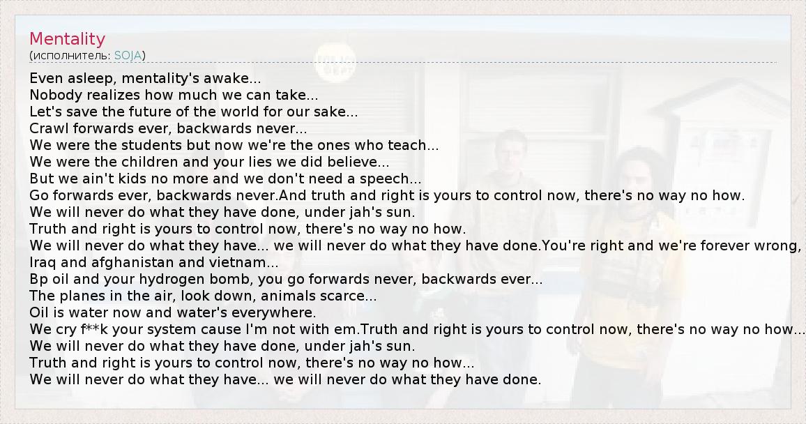 Это интересно:Soldiers of Jah Army (SOJA) — регги-коллектив, базирующейся в Арлингтоне, штат Виргиния в районе Вашингтона, округ Колумбия. Запуск в качестве активной группы в 1997 году, их музыка выпускается под лейблом Innerloop.Дискография * Soldiers of Jah Army (2000) * Peace in a Time of War (2003) * Dub in a Time of War (2005) * Get Wiser (2006) текст песен * Get Wiser Live DVD (2007) * Stars & Stripes EP (2008) * Born In Babylon (2009) * Strength... продолжение