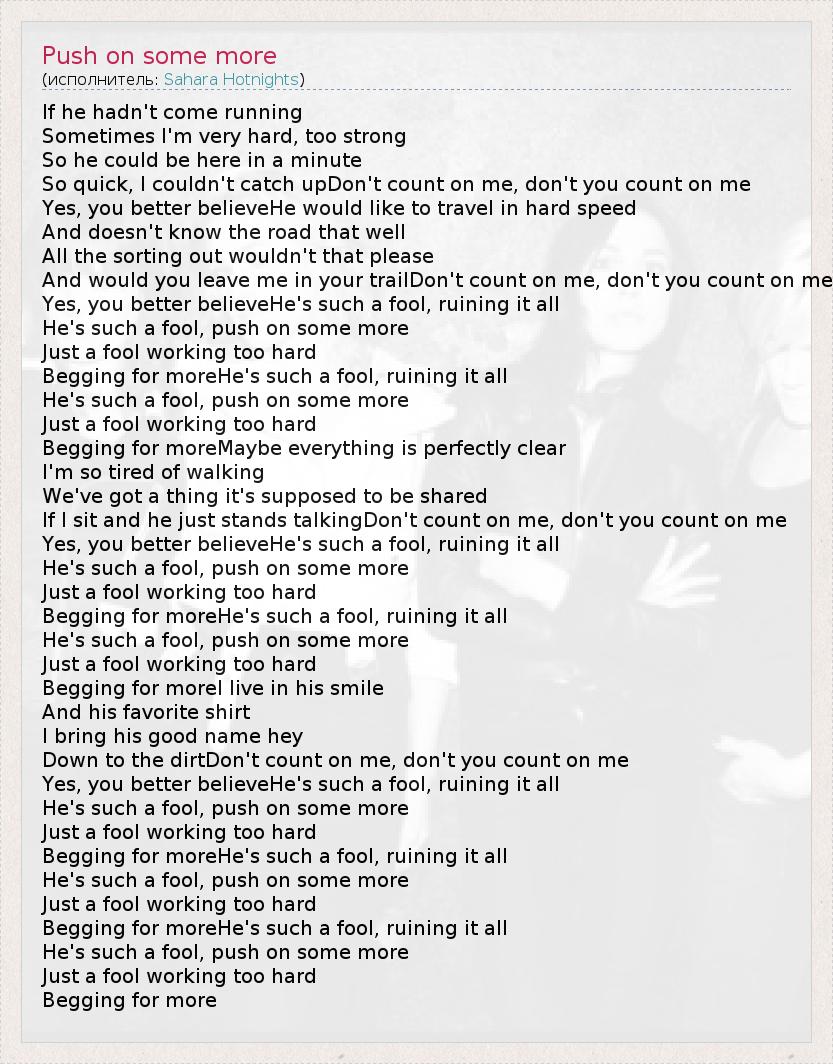 If he hadn't come running Sometimes I'm very hard, too strong So he could be here in a minute So quick, I couldn't catch upDon't count on me, don't you count on me Yes, you better believeHe would like to travel in hard speed And doesn't know the road that well All the sorting out wouldn't that please And would you leave me in your trailDon't count on me, don't you count on me Yes, you better believeHe's such a fool, ruining it all He's such a fool, push on some more Just a fool working too hard Begging for moreHe's such a fool, ruining it all He's such a fool, push on some more Just a fool working too hard Begging for moreMaybe everything is perfectly clear I'm so tired of walking We've got a thing it's supposed to be shared If I sit and he just stands talkingDon't count on me, don't you count on me Yes, you better believeHe's such a fool, ruining it all He's such a fool, push on some more Just a fool working too hard Begging for moreHe's such a fool, ruining it all He's such a fool, push on some more Just a fool working too hard Begging for moreI live in his smile And his favorite shirt I bring his good name hey Down to the dirtDon't count on me, don't you count on me Yes, you better believeHe's such a fool, ruining it all He's such a fool, push on some more Just a fool working too hard Begging for moreHe's such a fool, ruining it all He's such a fool, push on some more Just a fool working too hard Begging for moreHe's such a fool, ruining it all He's such a fool, push on some more Just a fool working too hard Begging for more