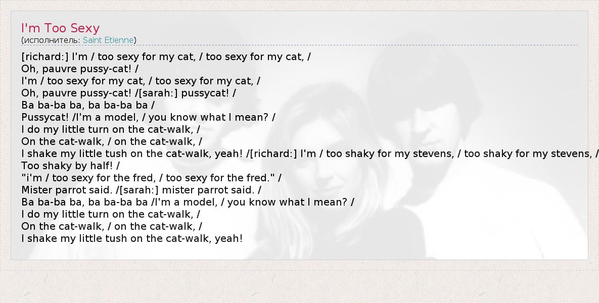 [richard:] I'm / too sexy for my cat, / too sexy for my cat, / Oh, pauvre pussy-cat! / I'm / too sexy for my cat, / too sexy for my cat, / Oh, pauvre pussy-cat! /[sarah:] pussycat! / Ba ba-ba ba, ba ba-ba ba / Pussycat! /I'm a model, / you know what I mean? / I do my little turn on the cat-walk, / On the cat-walk, / on the cat-walk, / I shake my little tush on the cat-walk, yeah! /[richard:] I'm / too shaky for my stevens, / too shaky for my stevens, / Too shaky by half! / "i'm / too sexy for the fred, / too sexy for the fred." / Mister parrot said. /[sarah:] mister parrot said. / Ba ba-ba ba, ba ba-ba ba /I'm a model, / you know what I mean? / I do my little turn on the cat-walk, / On the cat-walk, / on the cat-walk, / I shake my little tush on the cat-walk, yeah!