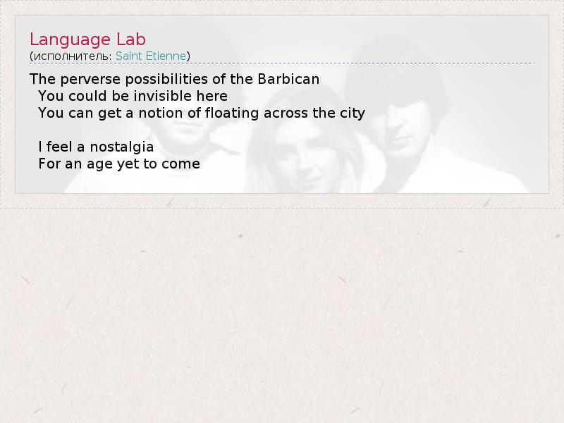 Это интересно:Трудно представить историю британской поп-музыки без «Saint Etienne». Их удивительная способность выпускать пластинки с настроением «шестидесятых» стала главной отличительной чертой группы. Вот уже десять лет «Saint Etienne» по праву занимают место самой стильной группы в Англии. «Музыка дизайнеров и арт-директоров» - такое определение «Saint Etienne» получили из уст одного журналиста. И действительно,... продолжение