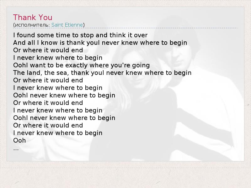 I found some time to stop and think it over And all I know is thank youI never knew where to begin Or where it would end I never knew where to begin OohI want to be exactly where you're going The land, the sea, thank youI never knew where to begin Or where it would end I never knew where to begin OohI never knew where to begin Or where it would end I never knew where to begin OohI never knew where to begin Or where it would end I never knew where to begin Ooh ...
