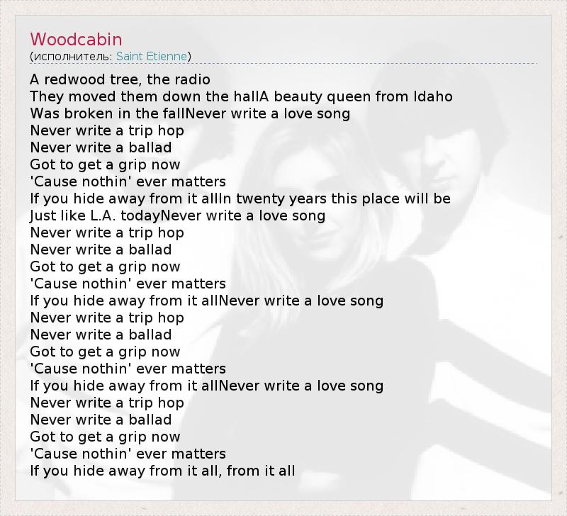 A redwood tree, the radio They moved them down the hallA beauty queen from Idaho Was broken in the fallNever write a love song Never write a trip hop Never write a ballad Got to get a grip now 'Cause nothin' ever matters If you hide away from it allIn twenty years this place will be Just like L.A. todayNever write a love song Never write a trip hop Never write a ballad Got to get a grip now 'Cause nothin' ever matters If you hide away from it allNever write a love song Never write a trip hop Never write a ballad Got to get a grip now 'Cause nothin' ever matters If you hide away from it allNever write a love song Never write a trip hop Never write a ballad Got to get a grip now 'Cause nothin' ever matters If you hide away from it all, from it all