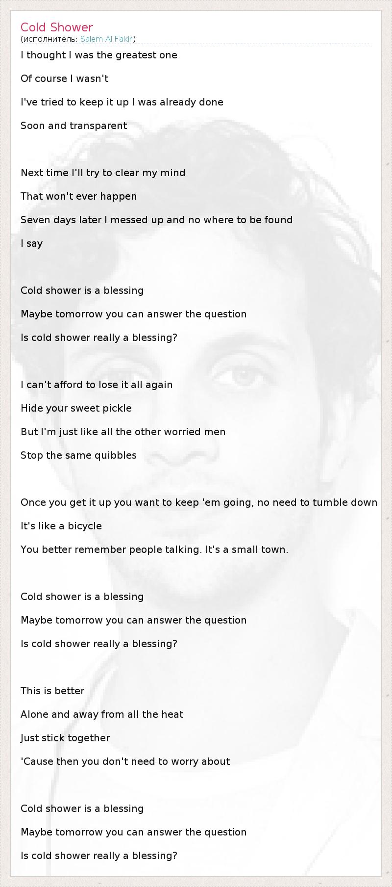 I thought I was the greatest one Of course I wasn't I've tried to keep it up I was already done Soon and transparent Next time I'll try to clear my mind That won't ever happen Seven days later I messed up and no where to be found I say Cold shower is a blessing Maybe tomorrow you can answer the question Is cold shower really a blessing? I can't afford to lose it all again Hide your sweet pickle But I'm just like all the other worried men Stop the same quibbles Once you get it up you want to keep 'em going, no need to tumble down It's like a bicycle You better remember people talking. It's a small town. Cold shower is a blessing Maybe tomorrow you can answer the question Is cold shower really a blessing? This is better Alone and away from all the heat Just stick together 'Cause then you don't need to worry about Cold shower is a blessing Maybe tomorrow you can answer the question Is cold shower really a blessing?