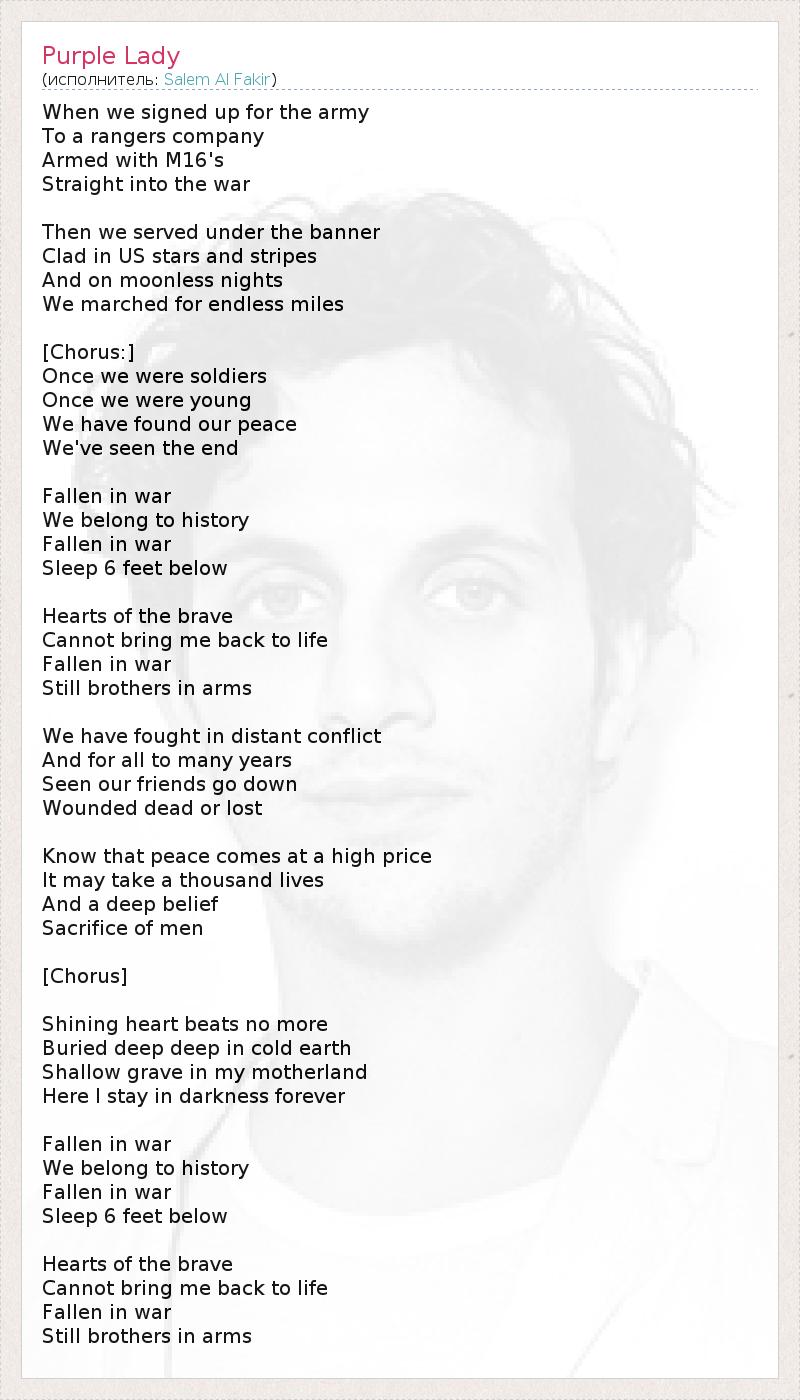 Когда мы в армии записались В десантный отряд, 1 Вооружившись М16 – 2 Прямиком на войну. Тогда мы служили под знаменем, Усыпанным американскими звёздами и полосками, И безлунными ночами Маршировали бесконечные мили. [Припев:] Однажды мы были солдатами, Однажды мы были юны, Мы нашли покой, Мы увидели конец. Павшие в войне, Мы принадлежим истории, Павшие в войне, Покоимся в шести футах под землёй. Сердца отважных Не могут возвратить меня к жизни. Павшие в войне Как и прежде наши братья по оружию. Мы сражались в далёких конфликтах, И в течение многих лет Наблюдали, как наши друзья гибнут – Раненые, мёртвые или пропавшие. Знайте, что за мир приходиться платить высокую цену, Он может потребовать тысячу жизней, Крепкую веру И человеческие жертвы. [Припев:] Сияющее сердце больше не бьётся, Погребённое глубоко-глубоко в холодной земле. Пустая могила на моей родине, Я навсегда останусь в этом мраке. Павшие в войне, Мы принадлежим истории, Павшие в войне, Покоимся в шести футах под землёй. Сердца отважных Не могут возвратить меня к жизни. Павшие в войне Как и прежде наши братья по оружию. * военная медаль США, вручаемая всем американским военнослужащим, погибшим или получившим ранения в результате действий противника, учреждённая в 1782 году. 1 – немного конкретнее – рейнджеры – бойцы десантных диверсионно-разведывательных отрядов. 2 – американская винтовка.