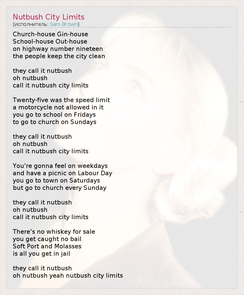 Church-house Gin-house School-house Out-house on highway number nineteen the people keep the city clean they call it nutbush oh nutbush call it nutbush city limits Twenty-five was the speed limit a motorcycle not allowed in it you go to school on Fridays to go to church on Sundays they call it nutbush oh nutbush call it nutbush city limits You're gonna feel on weekdays and have a picnic on Labour Day you go to town on Saturdays but go to church every Sunday they call it nutbush oh nutbush call it nutbush city limits There's no whiskey for sale you get caught no bail Soft Port and Molasses is all you get in jail they call it nutbush oh nutbush yeah nutbush city limits